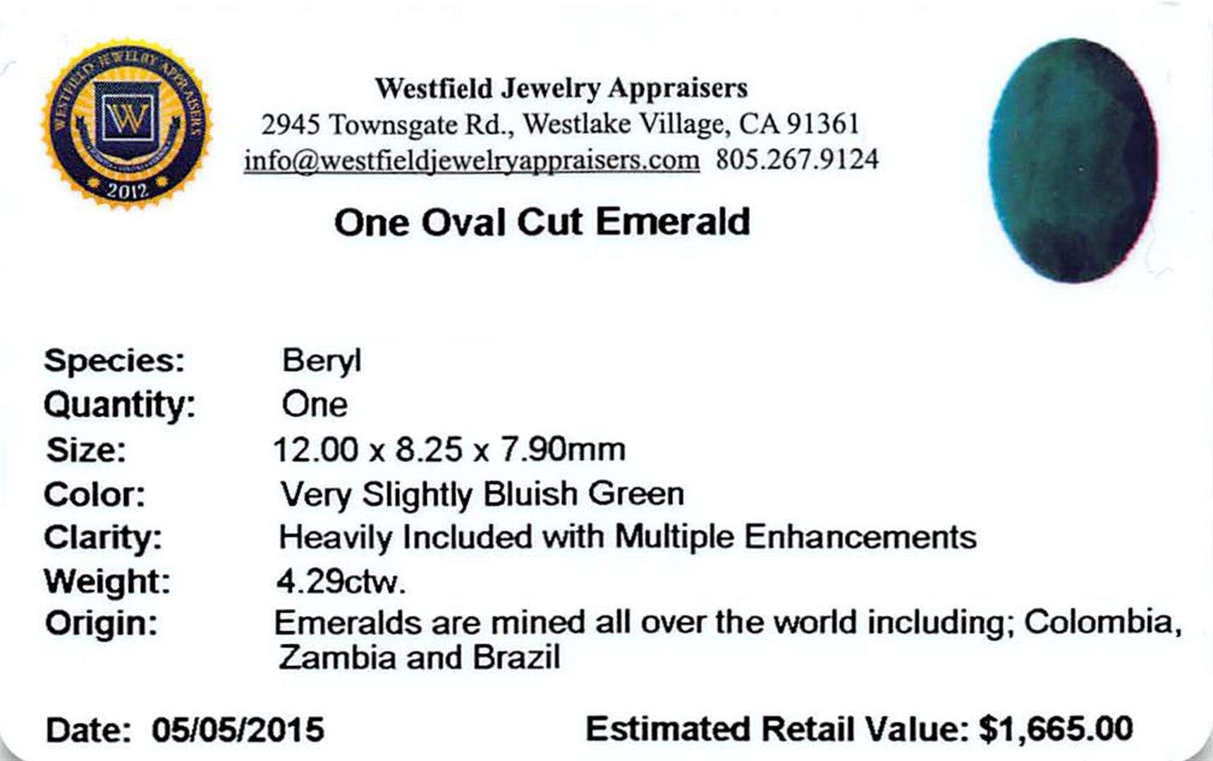 One oval mixed cut natural emerald, measuring 12.00 x 8.25 x 7.90mm, exact weight 4.29ct., clarity is heavily included, type III, medium dark, very slightly grayish, very slightly bluish green color, (GIA vslbG 6/3) Indications of multiple laboratory enhancements, including high temperature heat treatment. Westfield Appraised at $1,665.00.