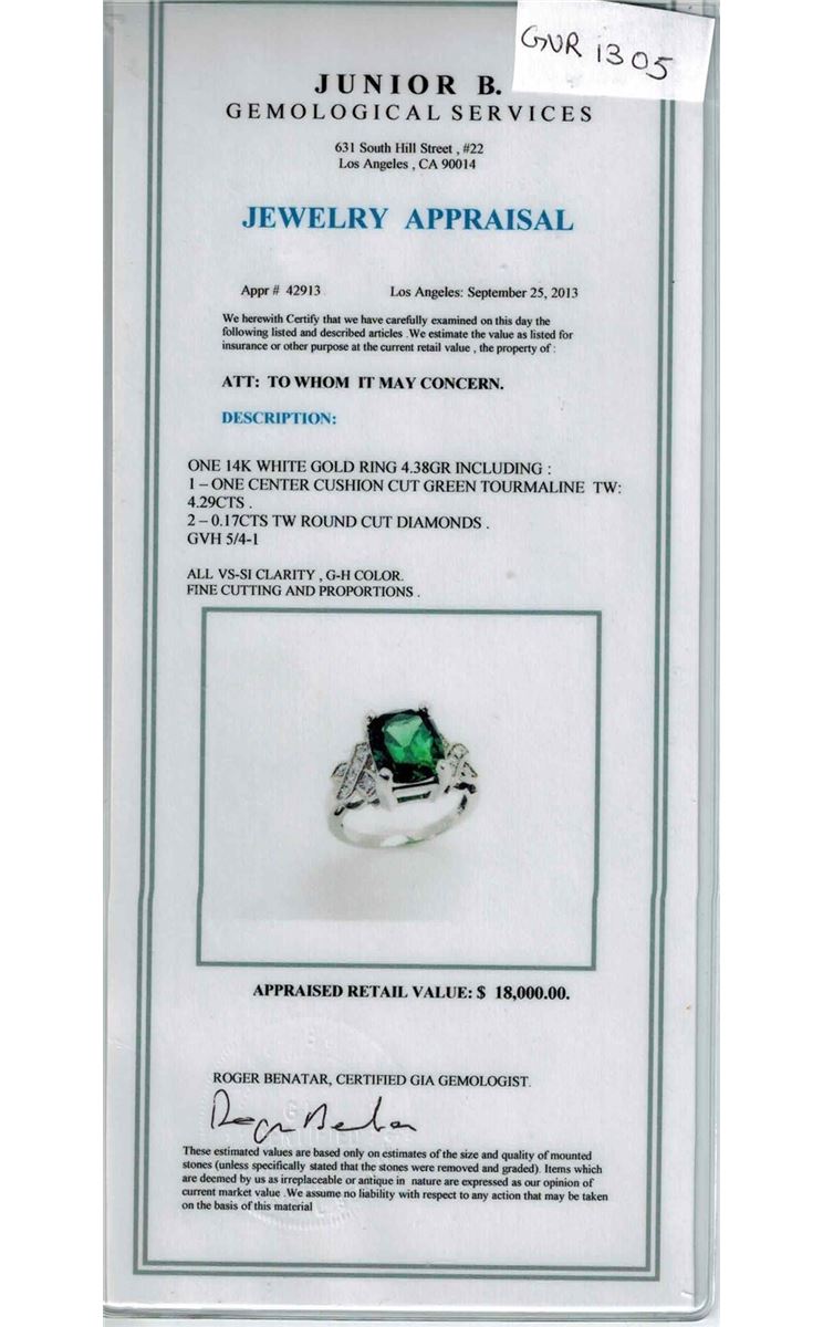 14K W/G NATURAL COPPER BEARING GREEN PARAIBA TOURMALINE RING: 4.38GRAM /GREEN TOURMALINE :4.29CT/DIAMOND RD :0.17CT/#GVR1305