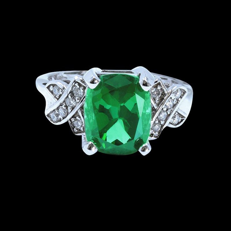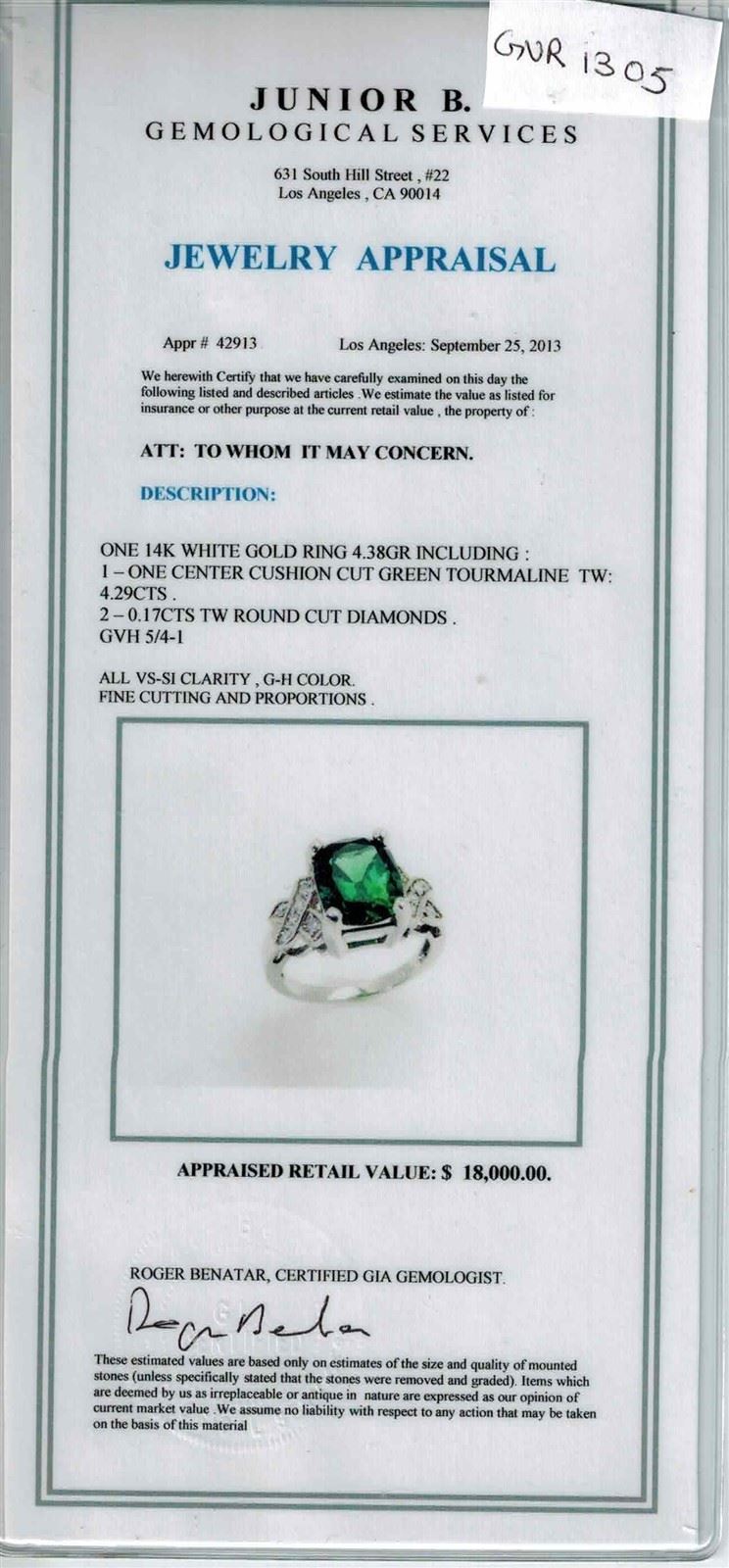 14K W/G NATURAL COPPER BEARING GREEN PARAIBA TOURMALINE RING: 4.38GRAM /GREEN TOURMALINE :4.29CT/DIAMOND RD :0.17CT/#GVR1305 **The vibrant green hue of this 4.29 carat cushion cut green Tourmaline is ideal for channeling nature's healing power. It attunes one to the energies of Earth as it opens the heart and stimulates the connection with the Divine. Flanked by twinkling 0.71 carat round cut Diamonds and artfully crafted in 18K white gold with sparkling detail along its shank, this ring is a beacon of love.**