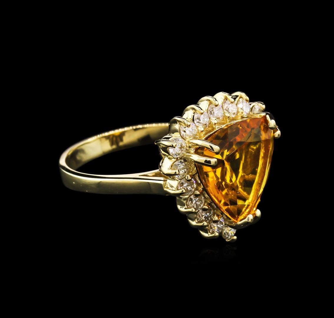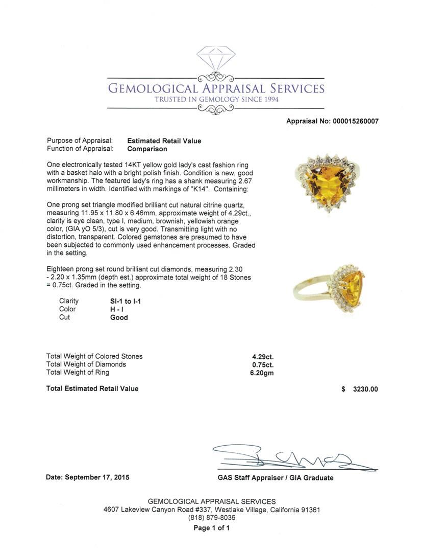 One electronically tested 14KT yellow gold lady's cast fashion ring with a basket halo with a bright polish finish. The featured lady's ring has a shank measuring 2.67 millimeters in width. Identified with markings of "K14". Condition is new, good workmanship. Containing: One prong set triangle modified brilliant cut natural citrine quartz, measuring 11.95 x 11.80 x 6.46mm, approximate weight of 4.29ct., clarity is eye clean, type I, medium, brownish, yellowish orange color, (GIA yO 5/3), cut is very good. Transmitting light with no distortion, transparent. Colored gemstones are presumed to have been subjected to commonly used enhancement processes. Graded in the setting. Eighteen prong set round brilliant cut diamonds, measuring 2.30 - 2.20 x 1.35mm (depth est.) approximate total weight of 18 Stones = 0.75ct. Graded in the setting. Clarity: SI-1 to I-1. Color: H - I. Cut Good. Total Weight of Colored Stones 4.29ct. Total Weight of Diamonds 0.75ct. Total Weight of Ring 6.20gm. GAS Appraised at $3,230.00.