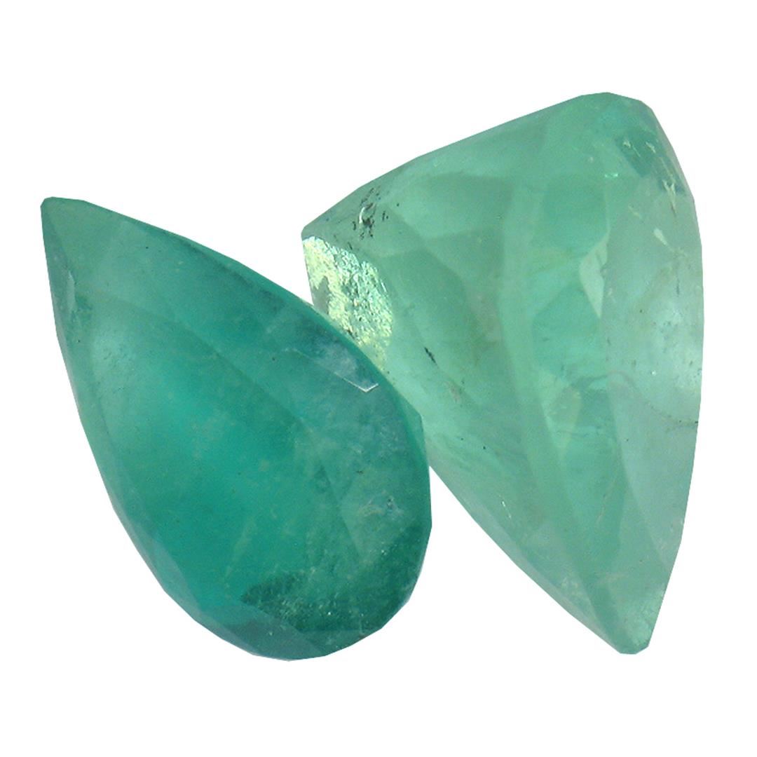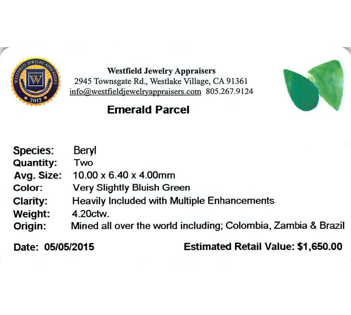 Two pear mixed cut natural emeralds, measuring 10.00 x 6.40 x 4.00mm, exact total weight 4.20ct., clarity is heavily included, type III, medium dark, very slightly grayish, very slightly bluish green color, (GIA vslbG 6/3), cut is good. Indications of multiple laboratory enhancements, including high temperature heat treatment. Westfield Appraised at $1,650.00.