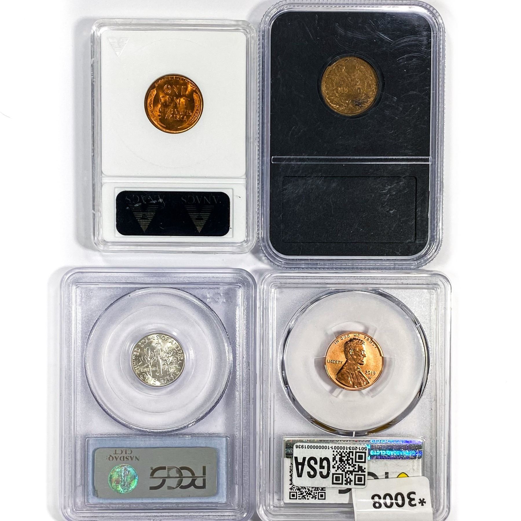 COINS AND CURRENCY LISTED IN GSA’S CATALOG AS GRADED AND ENCAPSULATED BY PCGS, NGC, ANACS, ICG, PCGS CURRENCY, PMG, PCGS BANKNOTE GRADING, CMC OR ANY OTHER THIRD-PARTY GRADING SERVICE ARE LIKEWISE SOLD “AS-IS” EXCEPT AS EXPRESSLY SET FORTH HEREIN. ALL THIRD-PARTY GRADING SERVICE GUARANTEES, INCLUDING AUTHENTICITY, ARE THE SOLE RESPONSIBILITY OF THE THIRD-PARTY GRADING SERVICE AND NOT WARRANTIES OR GUARANTEES OF GSA. BIDDERS SHOULD CONTACT THESE THIRD-PARTY GRADING SERVICES DIRECTLY WITH RESPECT TO ANY CLAIMS OR QUESTIONS THEY MAY HAVE CONCERNING THEIR GUARANTEES AND WARRANTIES. BIDDERS ACKNOWLEDGE AND AGREE THAT AUCTIONEER IS NOT BOUND BY OR LIABLE FOR ANY OPINION OR CERTIFICATION BY ANY THIRD-PARTY GRADING SERVICE. REMOVAL OF A PRODUCT FROM ITS PROTECTIVE CASING OR HOLDER OR ALTERATION OF ANY COIN HOLDER WAIVES ALL RIGHTS CONCERNING THE PRODUCT CONTAINED THEREIN.