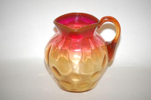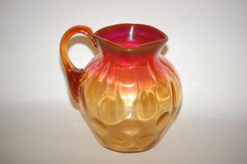 4 3/4" AMBERINA ART GLASS PITCHER-INVERTED THUMBPRINT PATTERN W/ PINCHED TOP RIM, APPLIED AMBER HANDLE & POLISHED BOTTOM (PROBABLY LIBBEY) - MINOR WEAR & SCRATCHES