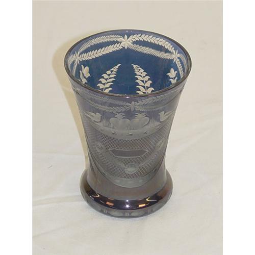 4 3/4" BOHEMIAN ART GLASS VASE - BLUE BACKGROUND W/ CLEAR & FROST CUTTING DECORATED W/ BIRDS & GARLAND- UNMARKED - WEAR