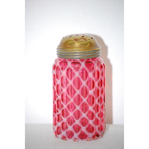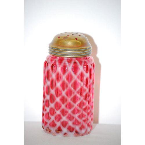 4 3/4" CRANBERRY OPALESCENT VICTORIAN ART GLASS SUGAR SHAKER W/ RIBBED OPALESCENT LATTICE DESIGN & OLD BRASSED CAP - WEAR TO CAP