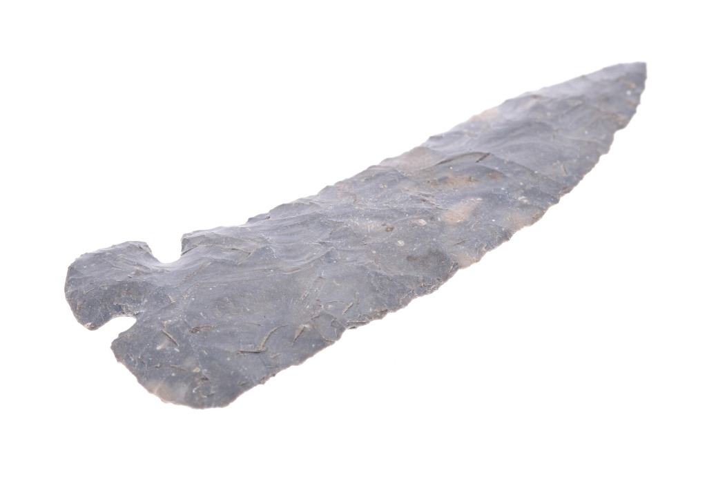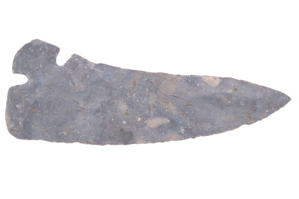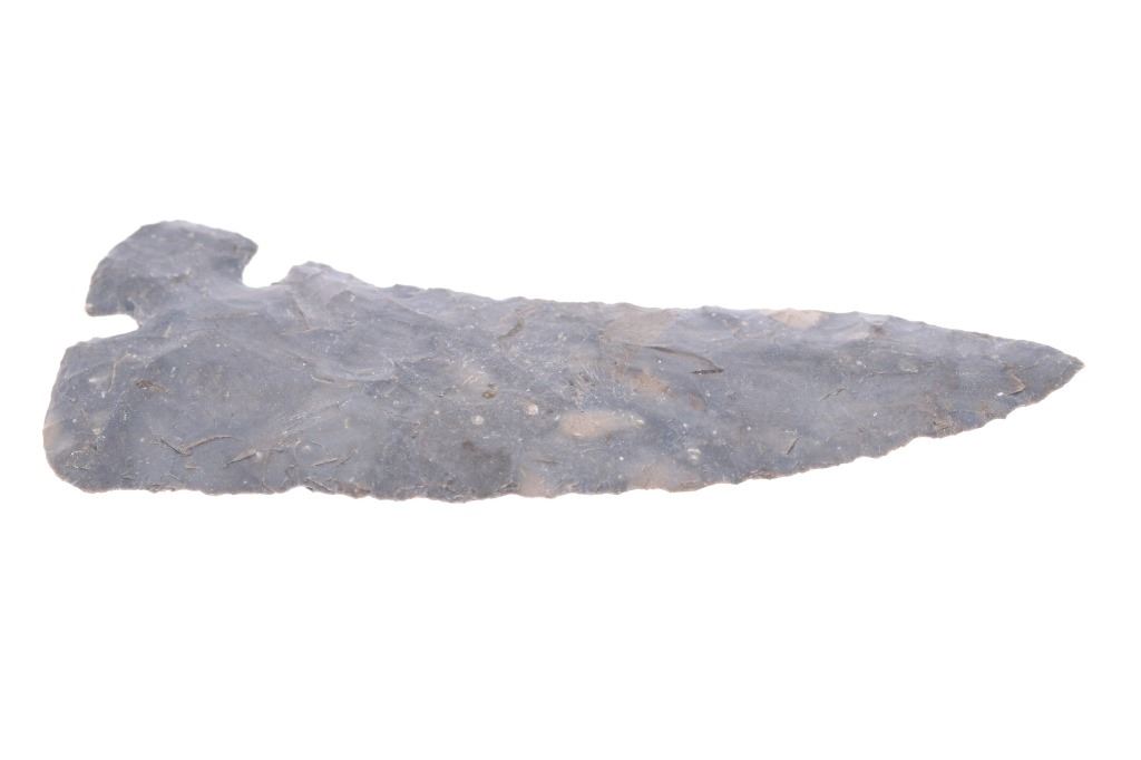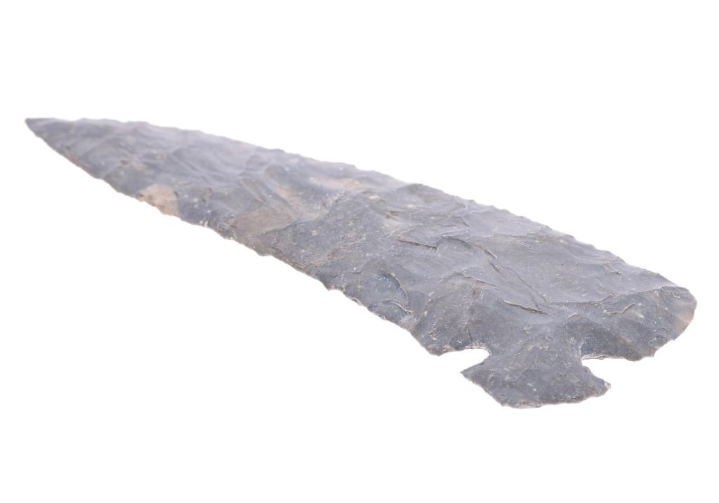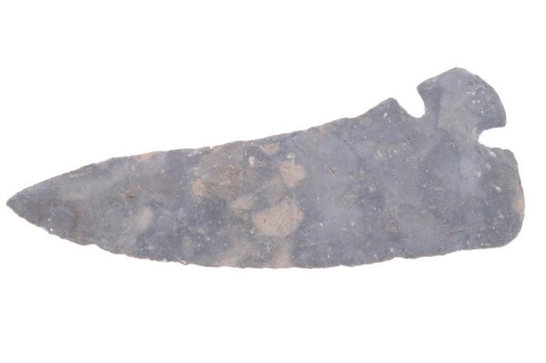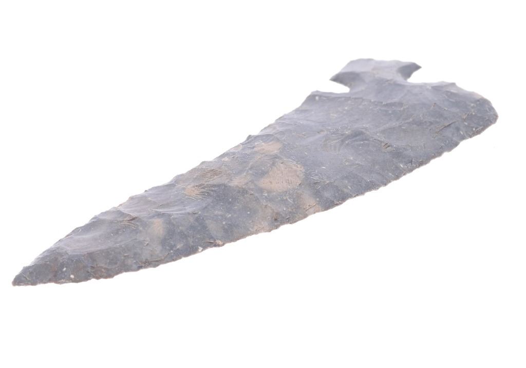 Featured in this lot is this 4 3/4" Corner Tang Knife point taken in Texas in 1923; and originally a part of the Ex-Collection of Jim Young. The point features a wonderfully and professionally crafted light grey flint material that shows a unique corner tang design with the notched tang seen on the bottom corner of the point with a excurvate serrated edge and a incurvate serrated edge making this point double sided but not symmetrical. The condition of this Corner Tang knife is well preserved with no obvious signs of damage and shows good overall condition. the measurements of this point is 4 3/4" x 1 3/4". The collective weight of this point is 37g.