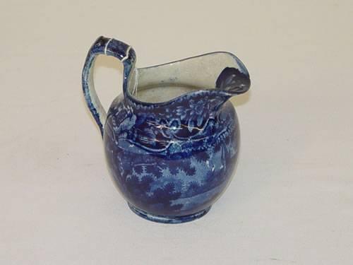 4 3/4" DARK BLUE STAFFORDSHIRE CREAMER W/ WOMAN W/ BLIND BOY PATTERN - VERY SMALL CHIP TO SPOUT;