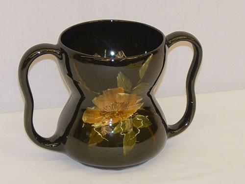 4 3/4" DICKENSWARE-WELLER HIGH GLAZED DOUBLE HANDLED LOVING CUP W/ FLORAL DECORATION-ARTIST SIGNED MS, SIGNED DICKENSWARE-WELLER ON BASE #371 - MINOR CRAZING, HAIRLINE ON RIGHT HANDLE