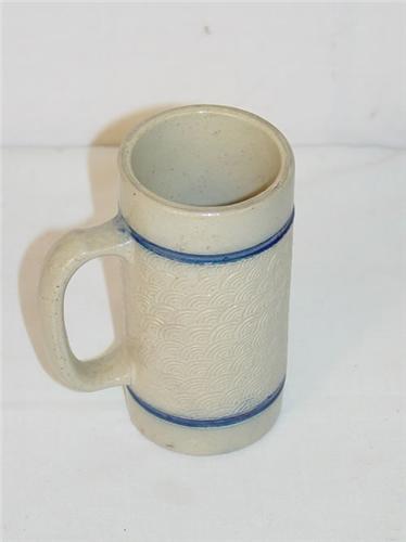 4 3/4" HANDLED MUG W/ 2 BLUE BANDS & CENTRAL EMBOSSED DESIGN