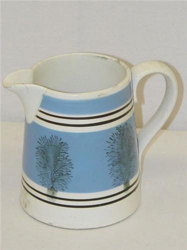 4 3/4" MOCHAWARE MEASURE/PITCHER W/ LARGE BLUE BANDS & SEAWEED DECORATION - SMALL HAIRLINE ON LIP & STAINS
