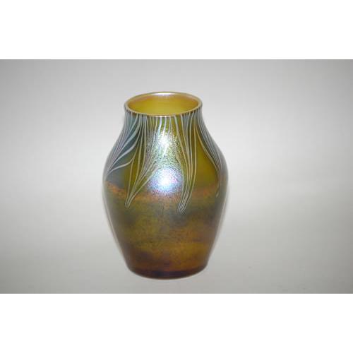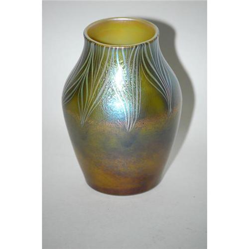 4 3/4" TIFFANY STYLE ART GLASS VASE - IRIDESCENT<BR>GREEN, GOLD & AMETHYST ART GLASS VASE W/ PULLED<BR>FEATHER DECORATION FROM THE RIM TO THE SHOULDER W/<BR>GROUND POLISHED BOTTOM-UNSIGNED - WEAR, BASE SCRATCHES<BR>& IMPERFECTIONS