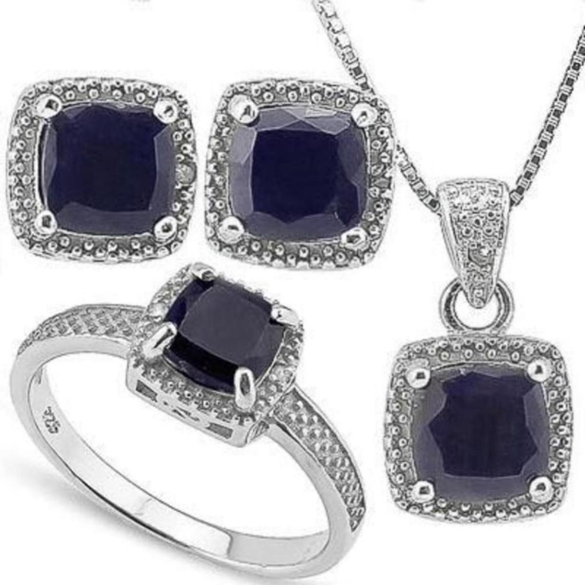 Black Sapphire stones due to their unique crystal structures reflect light in the shape of a star. Black Sapphires are a very expensive gemstone and can cost thousands of dollars. It is prized by gem lovers because of its beauty and rarity. Up for auction for a fraction of the cost is a beauty estate 4 3/5 Carat Black Sapphire Diamond Set in a 925 Sterling Silver. This is a full set which includes three fabulous sapphires, the winning bid will receive the earrings, necklace and ring !! Estimated value over $1700.00 with a very low starting bid - All items may be shipped or picked up locally within one week of sale. We will provide shipping estimates to the winning bidders or winning bidders may arrange their own shipping.