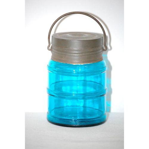 4 3/8" PATENTED BOSTON GLASS PAIL W/ BAIL HANDLE & TIN LID-ROBINS EGG BLUE, EMBOSSED ON BASE BOSTON MASS JUNE 24TH 1881 - GOOD CONDITION
