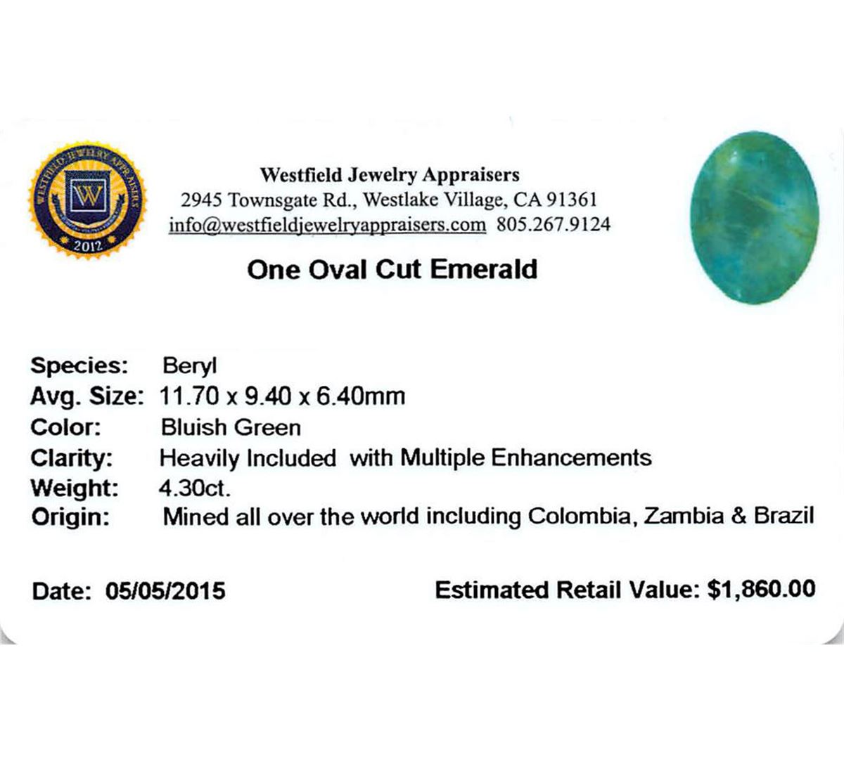One oval mixed cut natural emerald, measuring 11.70 x 9.40 x 6.40mm, exact weight 4.30ct., clarity is heavily included, type III, dark, very slightly grayish, bluish green color, (GIA bG 7/3), cut is good. Indications of multiple laboratory enhancements, including high temperature heat treatment. Westfield Appraised at $1,860.00.