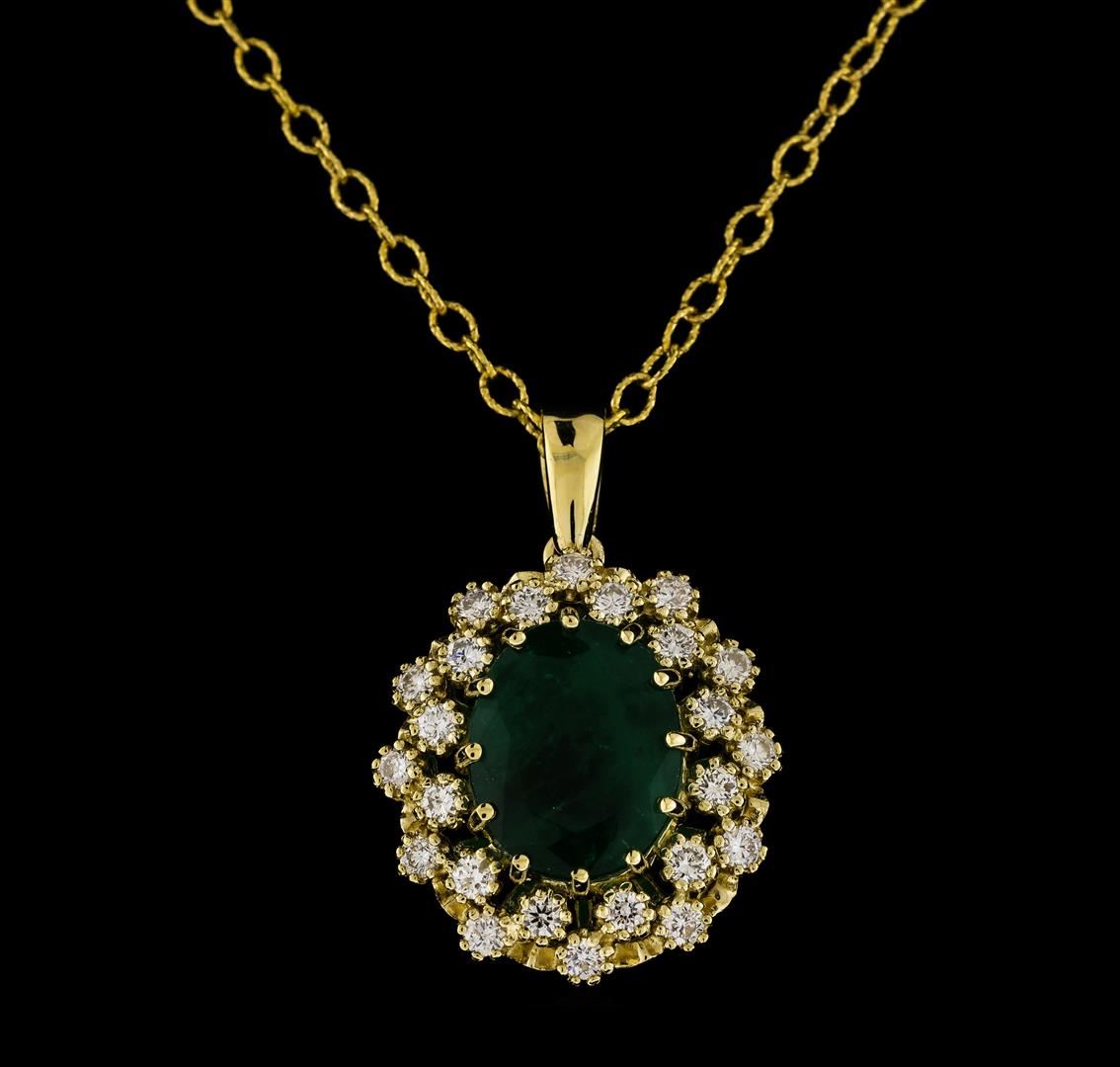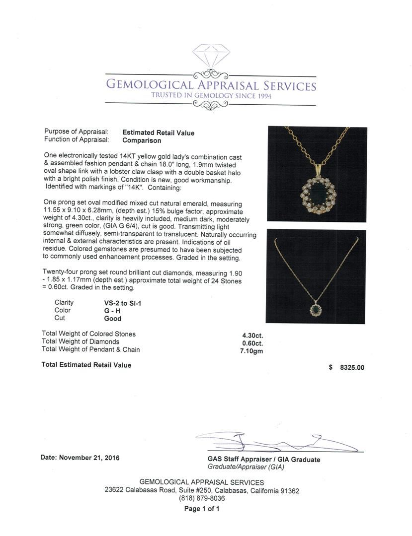 One electronically tested 14KT yellow gold lady's combination cast & assembled fashion pendant & chain 18.0' long, 1.9mm twisted oval shape link with a lobster claw clasp with a double basket halo with a bright polish finish. Identified with markings of '14K'. Condition is new, good workmanship. Containing: One prong set oval modified mixed cut natural emerald, measuring 11.55 x 9.10 x 6.28mm, (depth est.) 15%. bulge factor, approximate weight of 4.30ct., clarity is heavily included, medium dark, moderately strong, green color, (GIA G 6/4), cut is good. Transmitting light somewhat diffusely, semi-transparent to translucent. Naturally occurring internal & external characteristics are present. Indications of oil residue. Colored gemstones are presumed to have been subjected to commonly used enhancement processes. Graded in the setting. Twenty-Four prong set round brilliant cut diamonds, measuring 1.90 - 1.85 x 1.17mm (depth est.) approximate total weight of 24 Stones = 0.60ct. Graded in the setting. Clarity VS-2 to SI-1. Color: G - H Cut Good. Total Weight of Colored Stones 4.30ct.. Total Weight of Diamonds 0.60ct.. Total Weight of Pendant & Chain 7.10gm. GAS Appraised at $8,325.00.