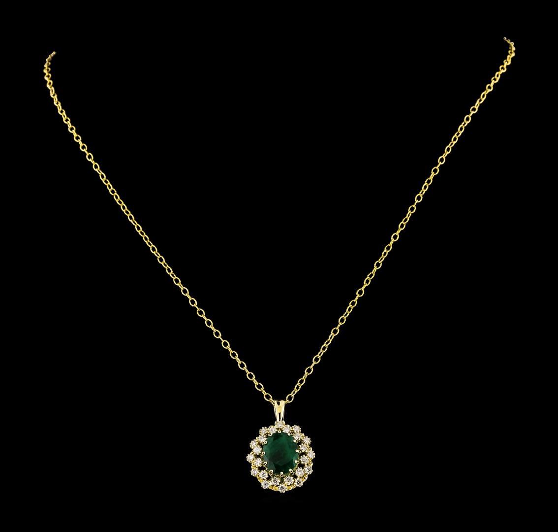 One electronically tested 14KT yellow gold lady's combination cast & assembled fashion pendant & chain 18.0' long, 1.9mm twisted oval shape link with a lobster claw clasp with a double basket halo with a bright polish finish. Identified with markings of '14K'. Condition is new, good workmanship. Containing: One prong set oval modified mixed cut natural emerald, measuring 11.55 x 9.10 x 6.28mm, (depth est.) 15%. bulge factor, approximate weight of 4.30ct., clarity is heavily included, medium dark, moderately strong, green color, (GIA G 6/4), cut is good. Transmitting light somewhat diffusely, semi-transparent to translucent. Naturally occurring internal & external characteristics are present. Indications of oil residue. Colored gemstones are presumed to have been subjected to commonly used enhancement processes. Graded in the setting. Twenty-Four prong set round brilliant cut diamonds, measuring 1.90 - 1.85 x 1.17mm (depth est.) approximate total weight of 24 Stones = 0.60ct. Graded in the setting. Clarity VS-2 to SI-1. Color: G - H Cut Good. Total Weight of Colored Stones 4.30ct.. Total Weight of Diamonds 0.60ct.. Total Weight of Pendant & Chain 7.10gm. GAS Appraised at $8,325.00.