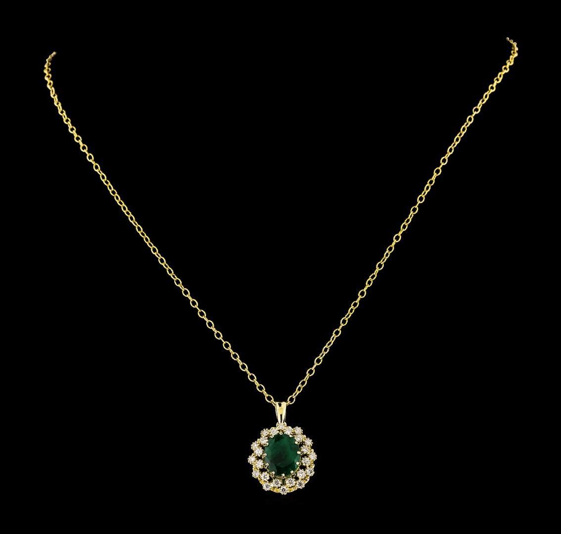One electronically tested 14KT yellow gold lady's combination cast & assembled fashion pendant & chain 18.0' long, 1.9mm twisted oval shape link with a lobster claw clasp with a double basket halo with a bright polish finish. Identified with markings of '14K'. Condition is new, good workmanship. Containing: One prong set oval modified mixed cut natural emerald, measuring 11.55 x 9.10 x 6.28mm, (depth est.) 15%. bulge factor, approximate weight of 4.30ct., clarity is heavily included, medium dark, moderately strong, green color, (GIA G 6/4), cut is good. Transmitting light somewhat diffusely, semi-transparent to translucent. Naturally occurring internal & external characteristics are present. Indications of oil residue. Colored gemstones are presumed to have been subjected to commonly used enhancement processes. Graded in the setting. Twenty-Four prong set round brilliant cut diamonds, measuring 1.90 - 1.85 x 1.17mm (depth est.) approximate total weight of 24 Stones = 0.60ct. Graded in the setting. Clarity VS-2 to SI-1. Color: G - H Cut Good. Total Weight of Colored Stones 4.30ct.. Total Weight of Diamonds 0.60ct.. Total Weight of Pendant & Chain 7.10gm. GAS Appraised.