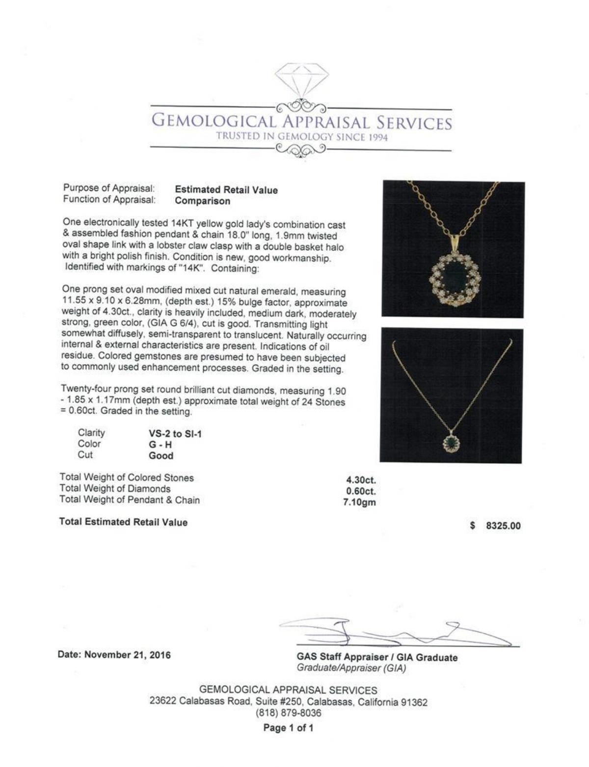 One electronically tested 14KT yellow gold lady's combination cast & assembled fashion pendant & chain 18.0' long, 1.9mm twisted oval shape link with a lobster claw clasp with a double basket halo with a bright polish finish. Identified with markings of '14K'. Condition is new, good workmanship. Containing: One prong set oval modified mixed cut natural emerald, measuring 11.55 x 9.10 x 6.28mm, (depth est.) 15%. bulge factor, approximate weight of 4.30 ct., clarity is heavily included, medium dark, moderately strong, green color, (GIA G 6/4), cut is good. Transmitting light somewhat diffusely, semi-transparent to translucent. Naturally occurring internal & external characteristics are present. Indications of oil residue. Colored gemstones are presumed to have been subjected to commonly used enhancement processes. Graded in the setting. Twenty-Four prong set round brilliant cut diamonds, measuring 1.90 - 1.85 x 1.17mm (depth est.) approximate total weight of 24 Stones = 0.60 ct. Graded in the setting. Clarity VS-2 to SI-1. Color: G - H Cut Good. Total Weight of Colored Stones 4.30 ct.. Total Weight of Diamonds 0.60 ct.. Total Weight of Pendant & Chain 7.10gm. GAS Appraised.