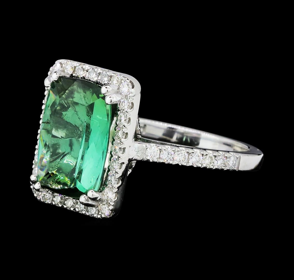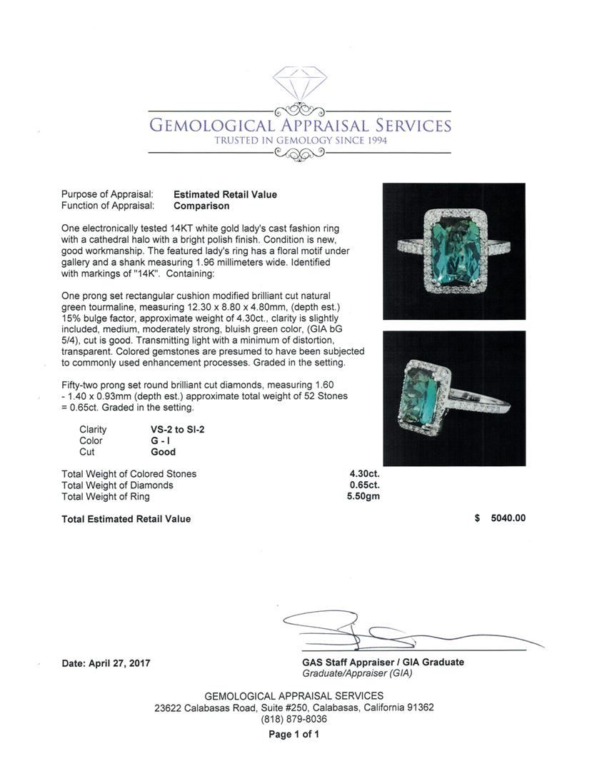 One electronically tested 14KT white gold lady's cast fashion ring with a cathedral halo with a bright polish finish. The featured lady's ring has a floral motif under gallery and a shank measuring 1.96 millimeters wide. Identified with markings of '14K'. Condition is new, good workmanship. Containing: One prong set rectangular cushion modified brilliant cut natural green tourmaline, measuring 12.30 x 8.80 x 4.80mm, (depth est.) 15%. bulge factor, approximate weight of 4.30ct., clarity is slightly included, medium, moderately strong, bluish green color, (GIA bG 5/4), cut is good. Transmitting light with a minimum of distortion, transparent. Colored gemstones are presumed to have been subjected to commonly used enhancement processes. Graded in the setting. Fifty-Two prong set round brilliant cut diamonds, measuring 1.60 - 1.40 x 0.93mm (depth est.) approximate total weight of 52 Stones = 0.65ct. Graded in the setting. Color G - I Clarity VS-2 to SI-2 Cut Good. Total Weight of Colored Stones 4.30ct.. Total Weight of Diamonds 0.65ct.. Total Weight of Ring 5.50gm GAS Appraised at $5040.00. GAS Appraised at $5,040.00.