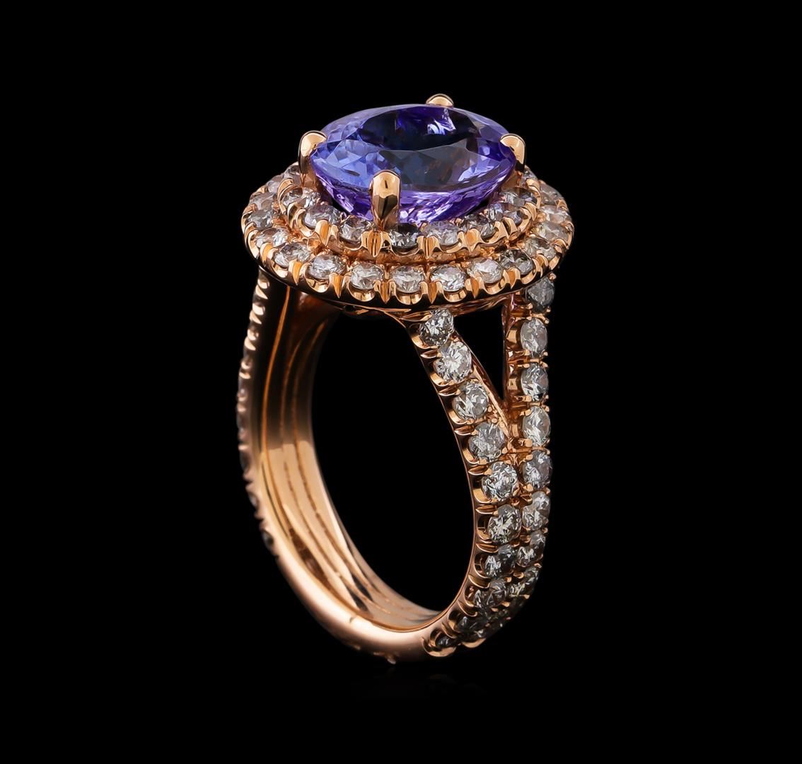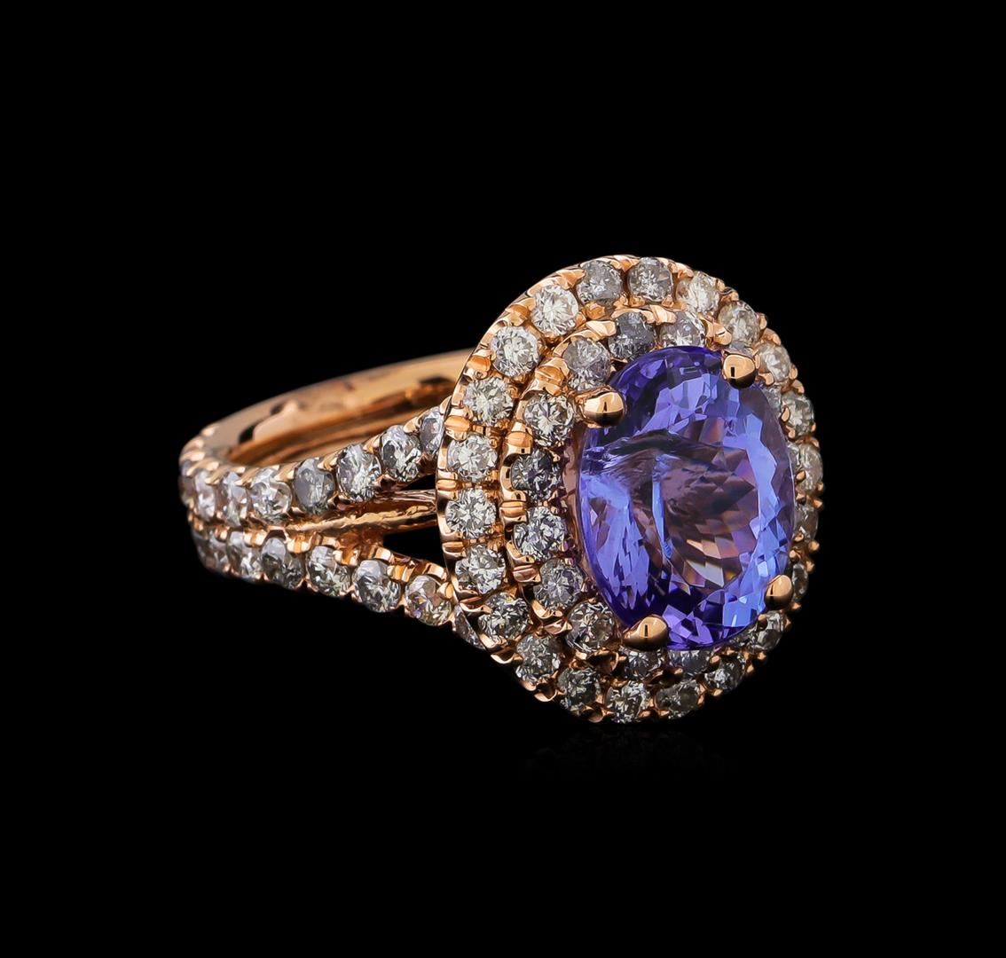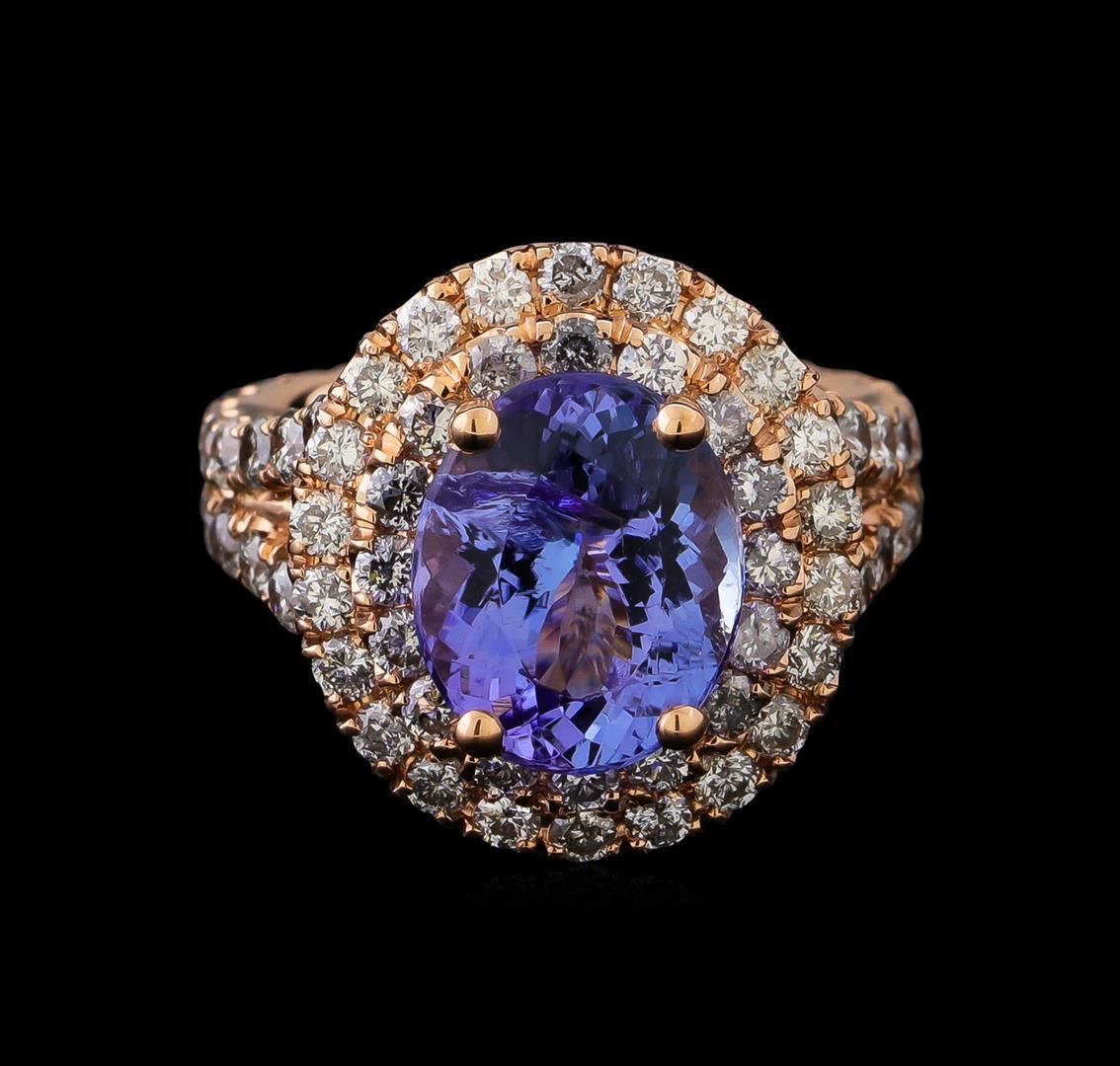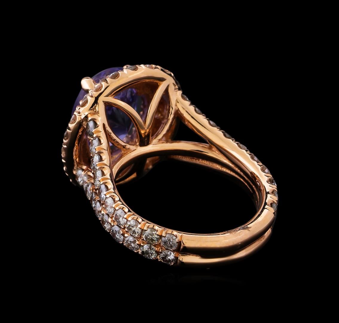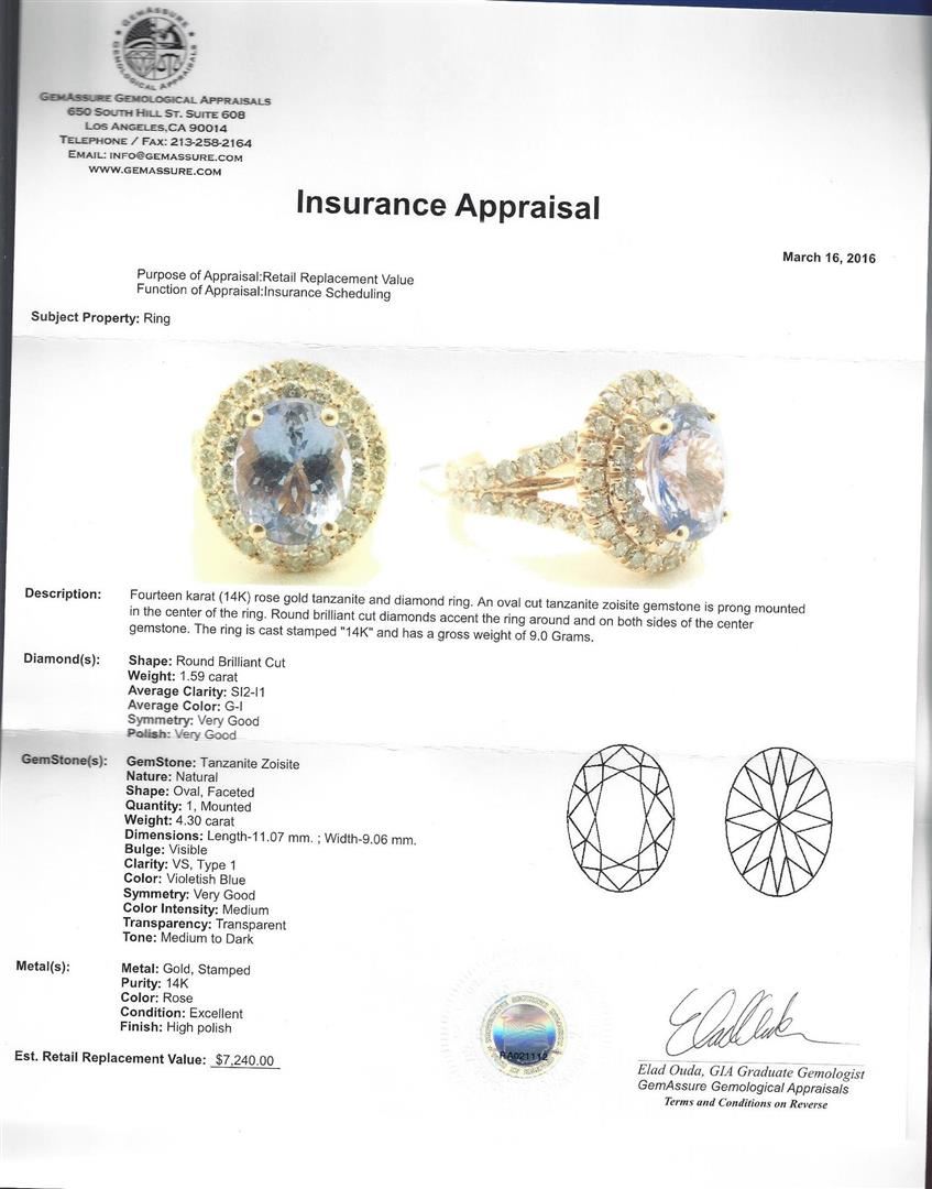 Fourteen karat (14K) rose gold tanzanite and diamond ring. An oval cut tanzanite zoisite gemstone is prong mounted in the center of the ring. Round brilliant cut diamonds accent the ring around and on both sides of the center gemstone. The ring is cast stamped "14K" and has a gross weight of 9.0 Grams. Diamond(s): Shape: Round brilliant cut. Weight: 1.59 carat. Average clarity: SI2-I1. Average color: G-I. Symmetry: Very good. Polish: Very good. Gemstone(s): Gemstone: Tanzanite Zoisite. Nature: Natural. Shape: Oval, faceted. Quantity: 1, mounted. Weight: 4.30 carat. Dimensions: Length-11.07 mm. ; Width-9.06 mm. Bulge: Visible. Clarity: VS, type 1. Color: Violetish blue. Symmetry: Very good. Color intensity: Medium. Transparency: Transparent. Tone: Medium to Dark. Metal(s): Metal: Gold, stamped. Purity: 14K. Color: Rose. Condition: Excellent. Finish: High polish. GGA Appraised at $7,240.00.