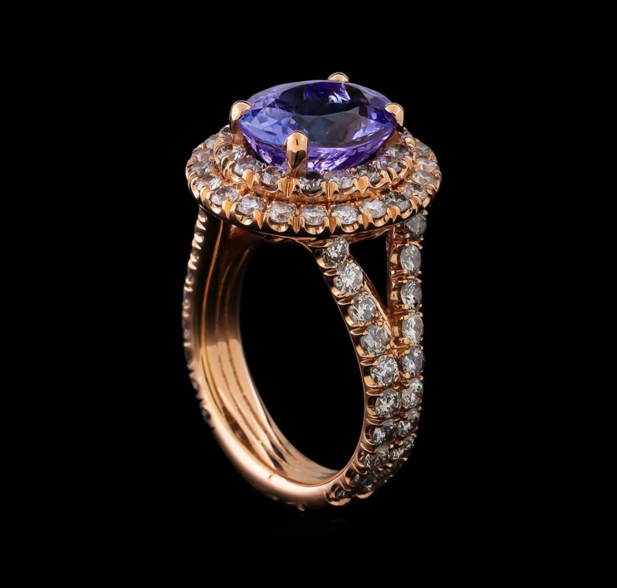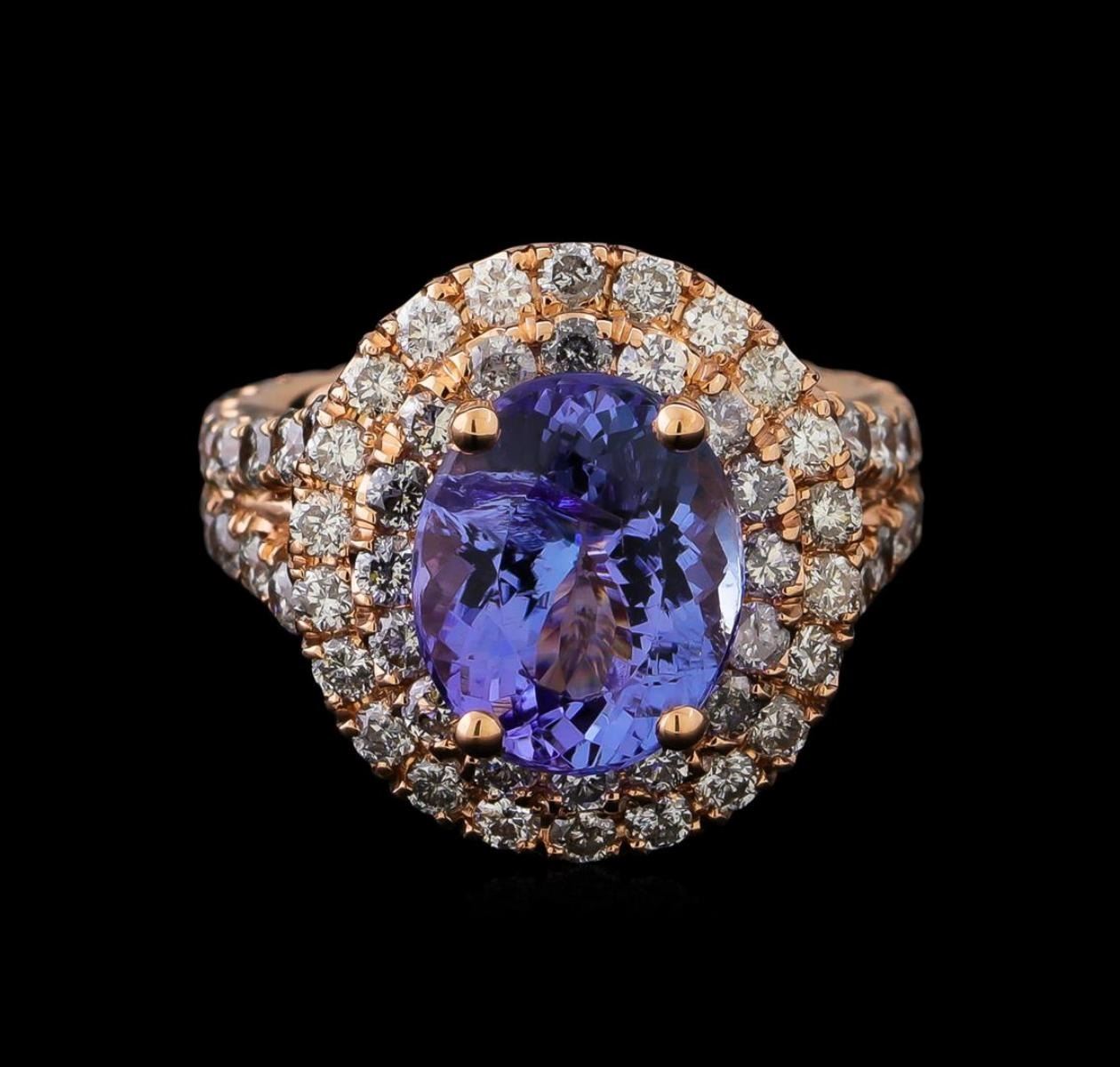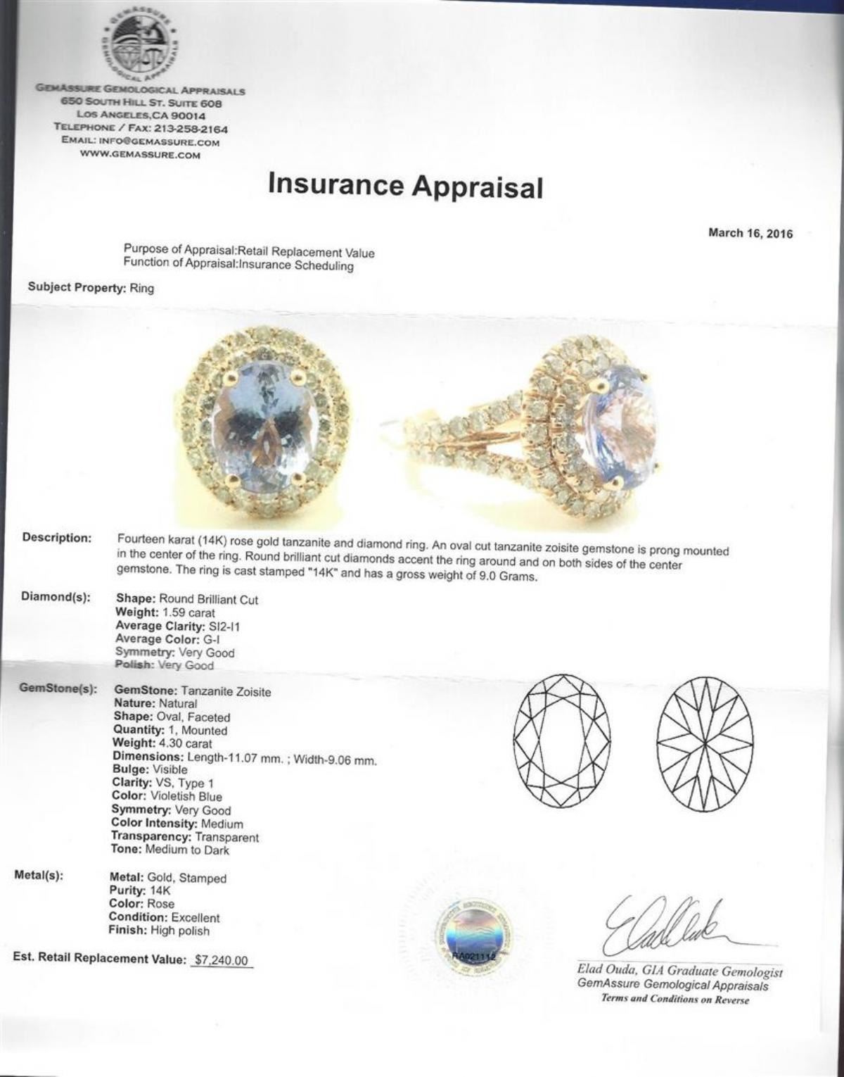 Fourteen karat (14K) rose gold tanzanite and diamond ring. An oval cut tanzanite zoisite gemstone is prong mounted in the center of the ring. Round brilliant cut diamonds accent the ring around and on both sides of the center gemstone. The ring is cast stamped "14K" and has a gross weight of 9.0 Grams. Diamond(s): Shape: Round brilliant cut. Weight: 1.59 carat. Average clarity: SI2-I1. Average color: G-I. Symmetry: Very good. Polish: Very good. Gemstone(s): Gemstone: Tanzanite Zoisite. Nature: Natural. Shape: Oval, faceted. Quantity: 1, mounted. Weight: 4.30 carat. Dimensions: Length-11.07 mm. ; Width-9.06 mm. Bulge: Visible. Clarity: VS, type 1. Color: Violetish blue. Symmetry: Very good. Color intensity: Medium. Transparency: Transparent. Tone: Medium to Dark. Metal(s): Metal: Gold, stamped. Purity: 14K. Color: Rose. Condition: Excellent. Finish: High polish. GGA Appraised.