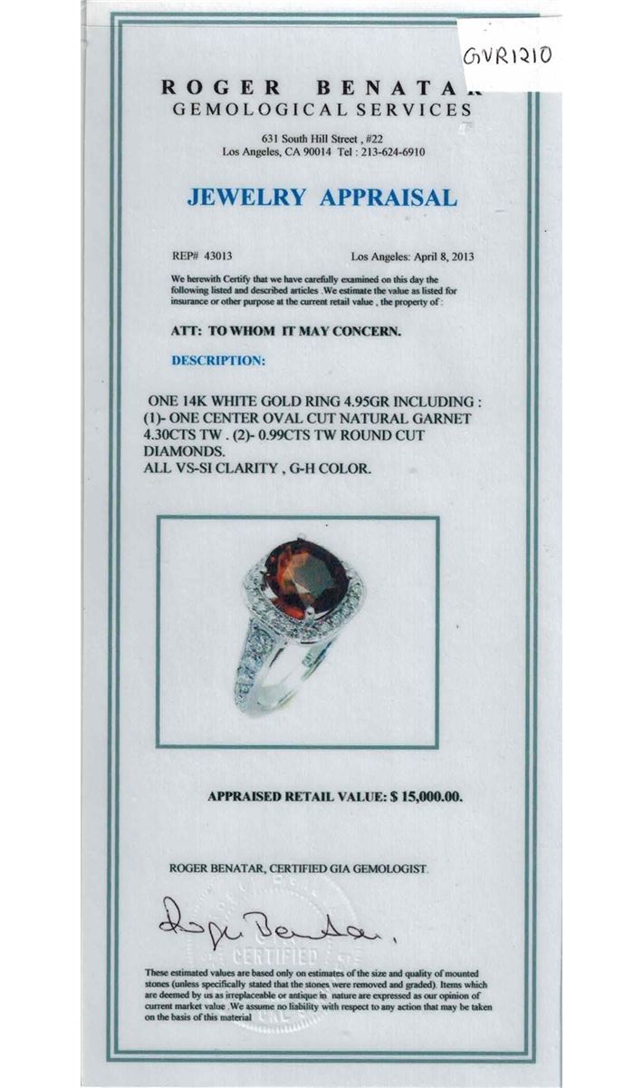 14K WHITE GOLD NATURAL MALAYA GARNET RING :4.59 GRAMS/MALAYA GARNET:4.30CT/DIAMOND RD :0.99CT/#GVR1210/MALAYA GARNET IS THE VERY RARE GARNET IN THE GARNET FAMILY. VERY HARD TO FIND THIS KIND OF COLOR AND QULAITY