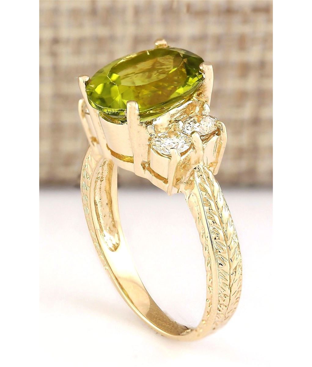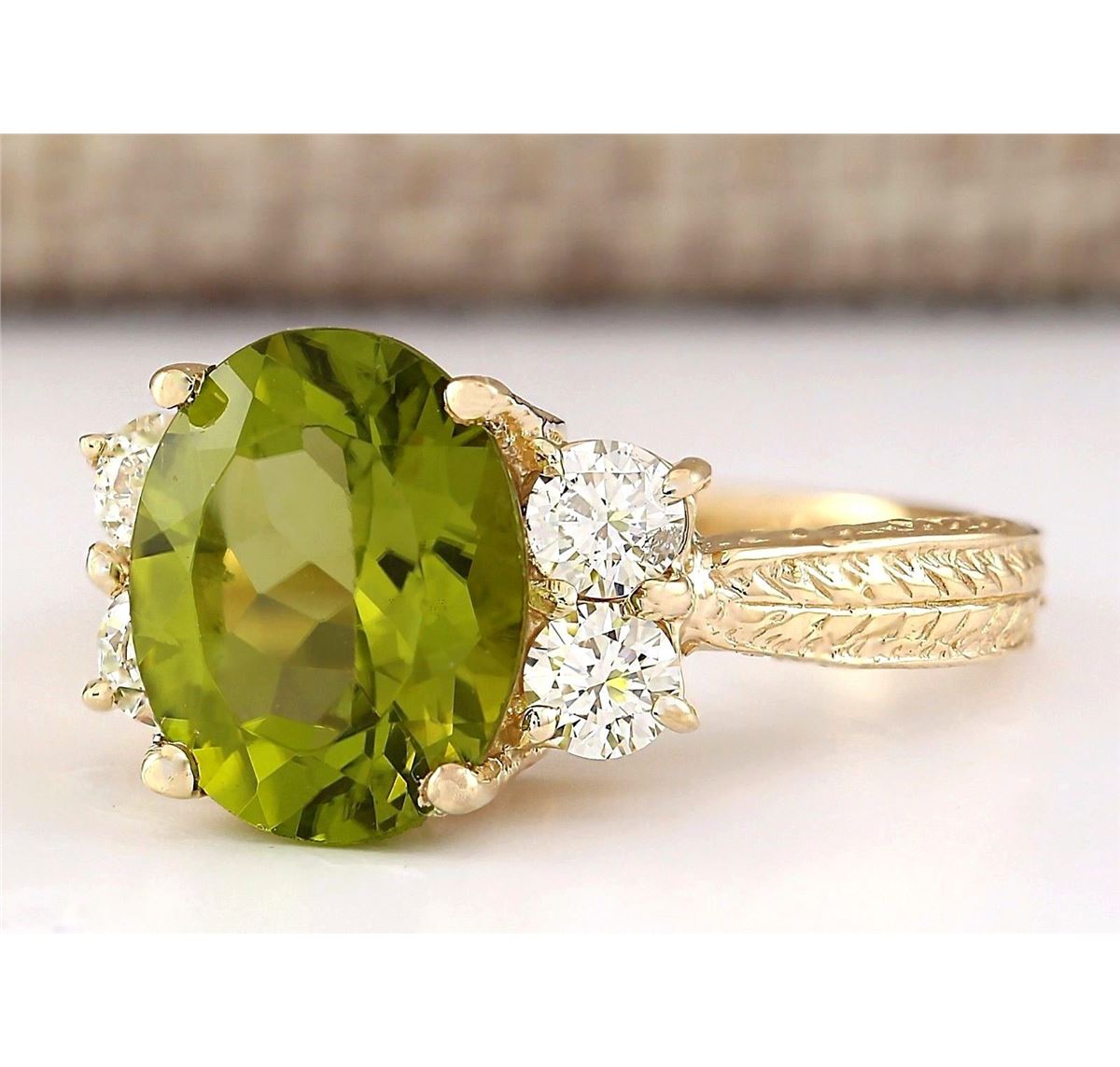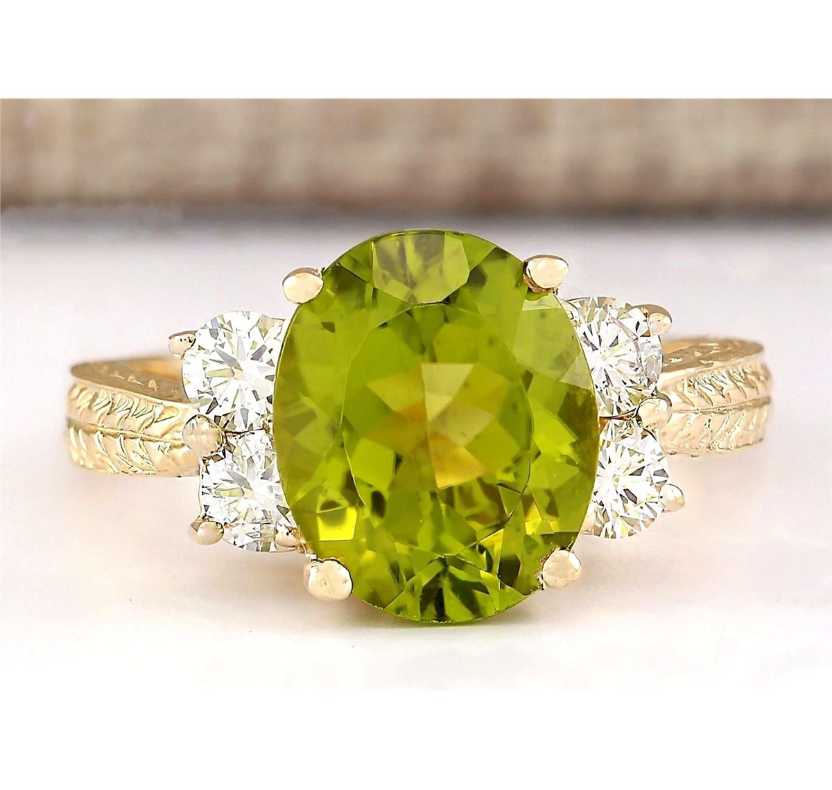 Stamped: 14K Ring Size: 6.5 Total Ring Weight: 5.9 Grams Diamond Weight: Total natural diamond weight is .60carat. SI1-SI2 clarity / G-H color Gemstone Weight: Total Natural Peridot Weight is 3.71ctw (Measures: 1.090x8.98mm) Main Stone Color: Green Face Measures: 10.90x14.02mm SKU: [703366]