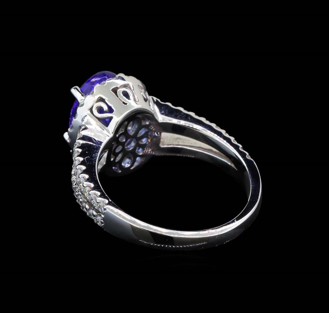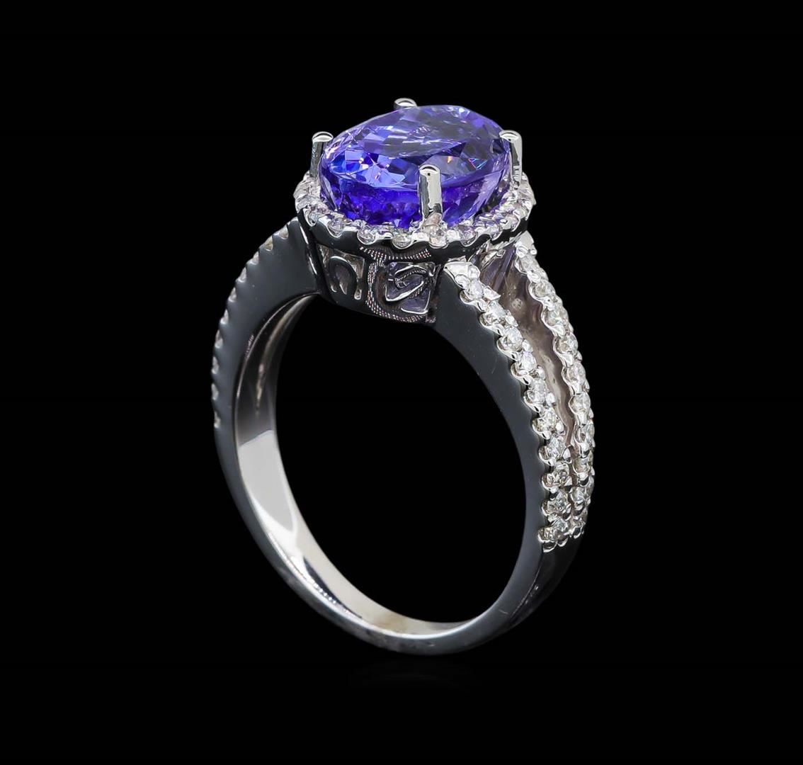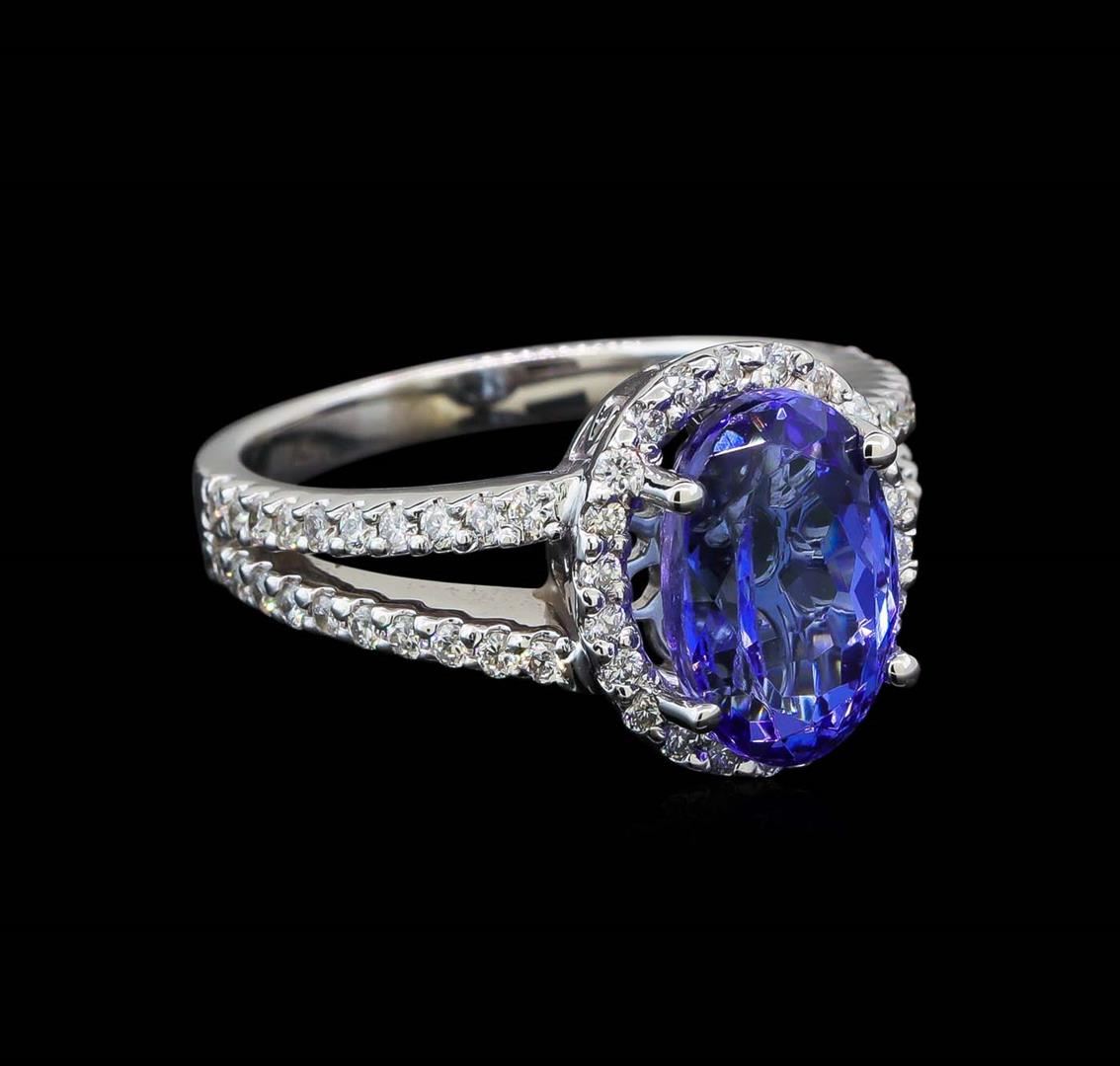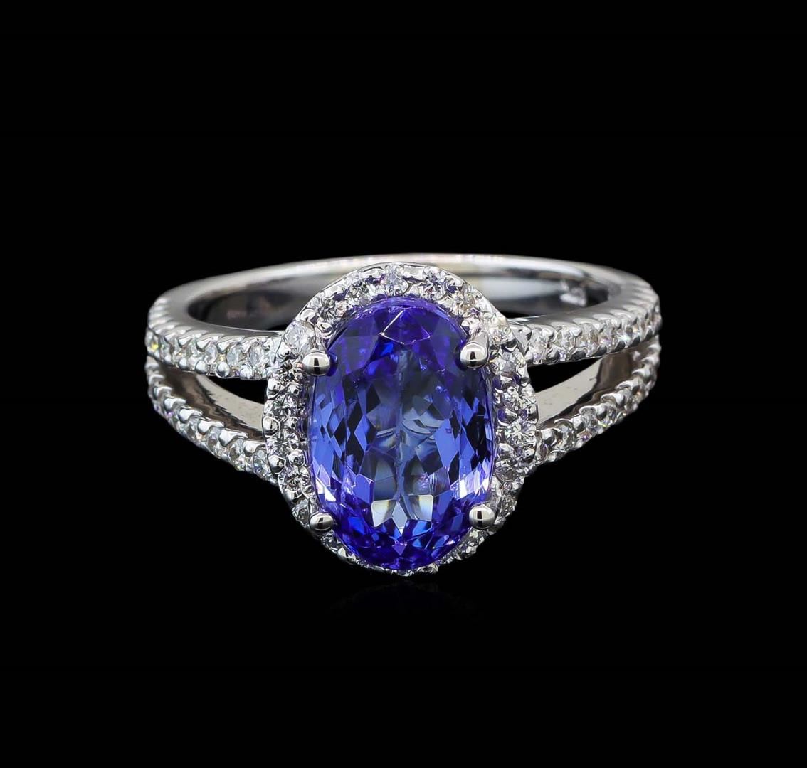 One electronically tested 14KT white gold lady's cast fashion ring with a split shank basket halo with a bright polish finish. The featured lady's ring has a shank measuring 2.37 millimeters wide. Identified with markings of '14K'. Condition is new, good workmanship. Containing: One prong set oval modified brilliant cut natural tanzanite, measuring 11.25 x 7.55 x 5.95mm, (depth est.) 20%. bulge factor, approximate weight of 4.31ct., clarity is eye clean, medium light, moderately strong, violetish blue color, (GIA vB 4/4), cut is good. Transmitting light with no distortion, transparent. Colored gemstones are presumed to have been subjected to commonly used enhancement processes. Graded in the setting. Sixty-Two prong set round brilliant cut diamonds, measuring 1.45 - 1.35 x 0.87mm (depth est.) approximate total weight of 62 Stones = 0.65ct. Graded in the setting. Clarity SI-1 to I-1. Color: G - I Cut Good. Total Weight of Colored Stones 4.31ct.. Total Weight of Diamonds 0.65ct.. Total Weight of Ring 7.00gm. GAS Appraised at $7,950.00.