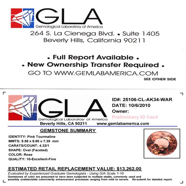 Excellent rose colored specimen oval cut; lab quality evaluation 10; treatment as noted; Gem Guide wholesale $1728-$3024; full retail appraisal $13262; full lab evaluation available