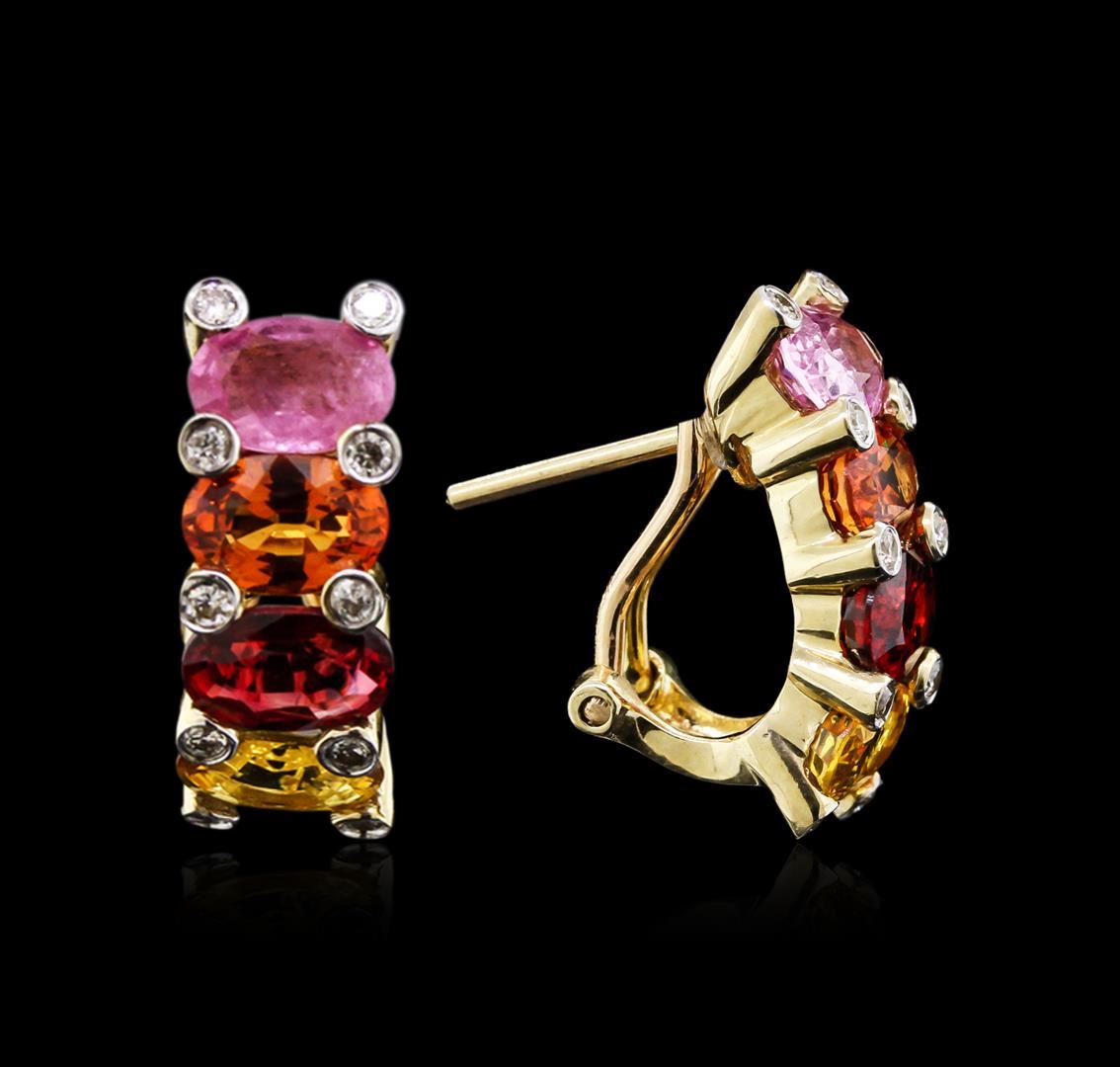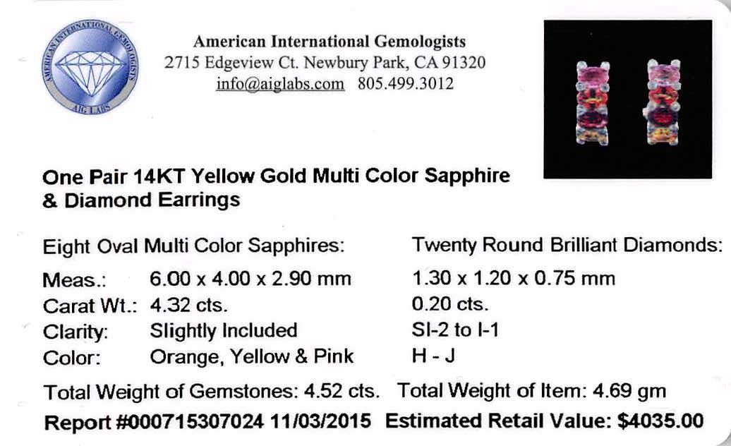 One Pair 14KT Yellow Gold Multi Color Sapphire and Diamond Earrings: Eight Oval Multi Color Sapphires: Measures: 6.00 x 4.00 x 2.90 mm. Carat Weight: 4.32cts. Clarity: Slightly Included. Color: Orange, Yellow, and Pink. Twenty Round Brilliant Diamonds: measures: 1.30 x 1.20 x 0.75 mm. Carat Weight: 0.20cts. Clarity: SI-2 to I-1. Color: H - J. Total Weight of Gemstones: 4.52cts. Total Weight of Item: 4.69gm. AIG Appraised at $4,035.00.