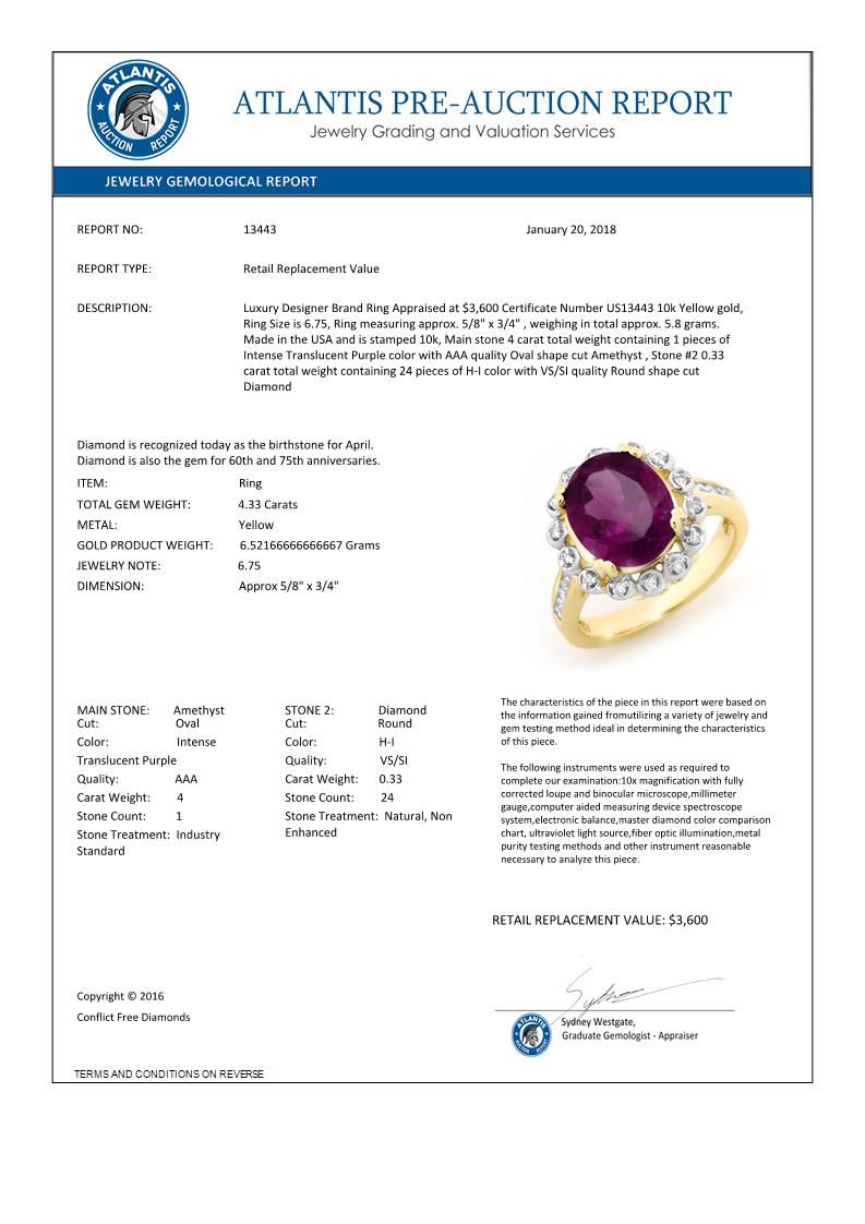 REF-50N2Y -13443 ---- 4.33 CTW Amethyst & Diamond Ring 10K Yellow Gold ---- Luxury Designer Brand Ring Appraised at $3,600 Certificate Number US13443 10k Yellow gold, Ring Size is 6.75, Ring measuring approx. 5/8" x 3/4" , weighing in total approx. 5.8 grams. Made in the USA and is stamped 10k, Main stone 4 carat total weight containing 1 pieces of Intense Translucent Purple color with AAA quality Oval shape cut Amethyst , Stone #2 0.33 carat total weight containing 24 pieces of H-I color with VS/SI quality Round shape cut Diamond