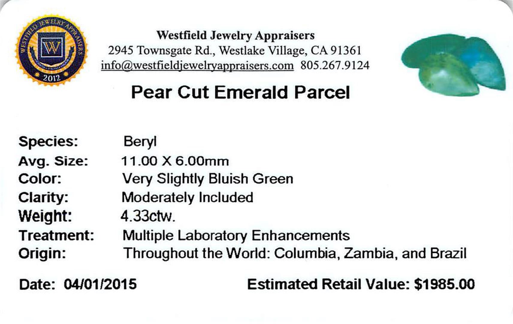 Three pear mixed cut natural emeralds exact total weight 4.33ct., clarity is moderately included, type III, medium dark, very slightly grayish, very slightly bluish green color, (GIA vslbG 6/3), cut is good. Westfield Appraised at $1,985.00.