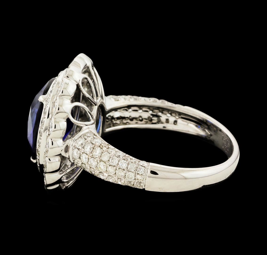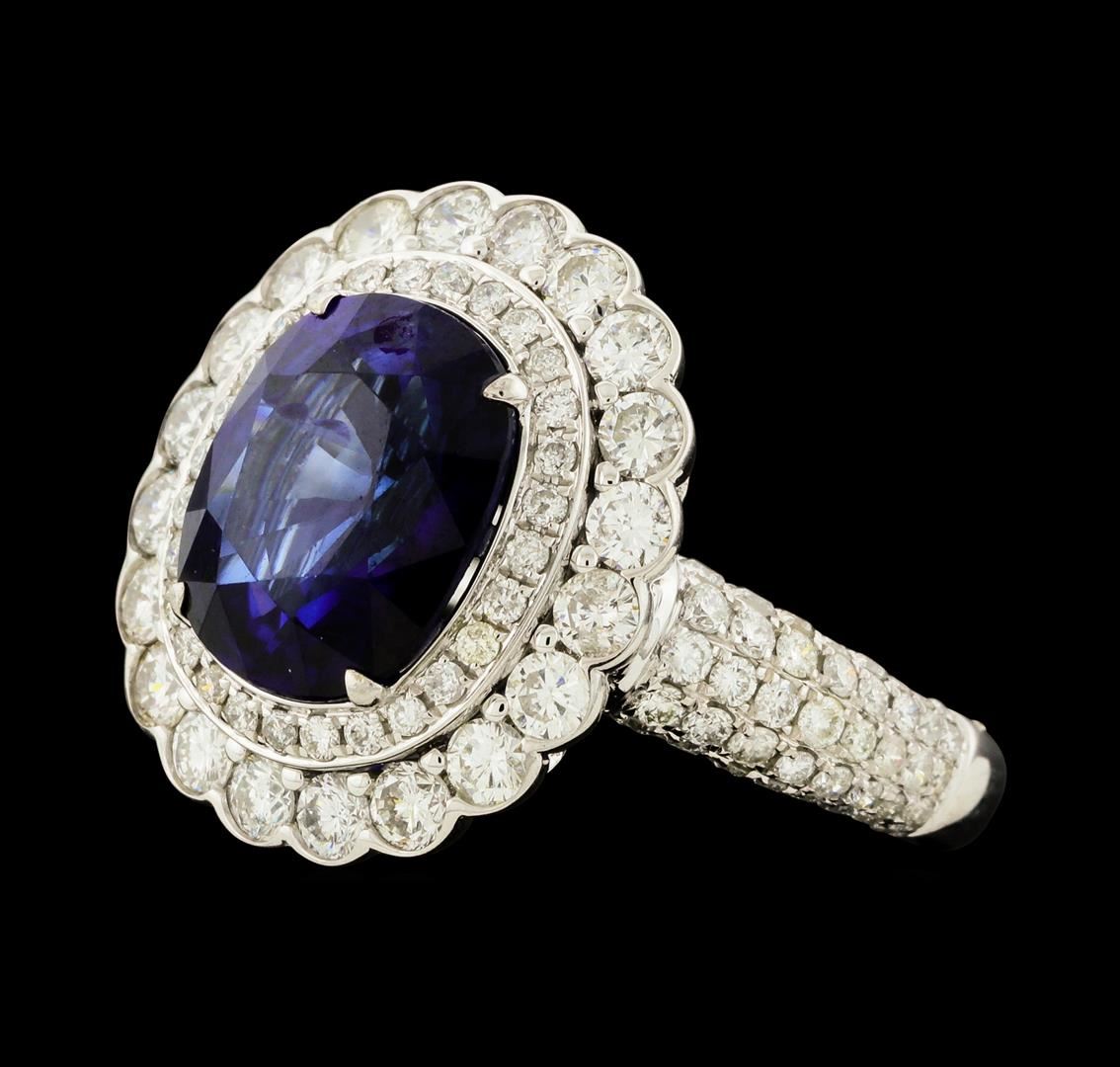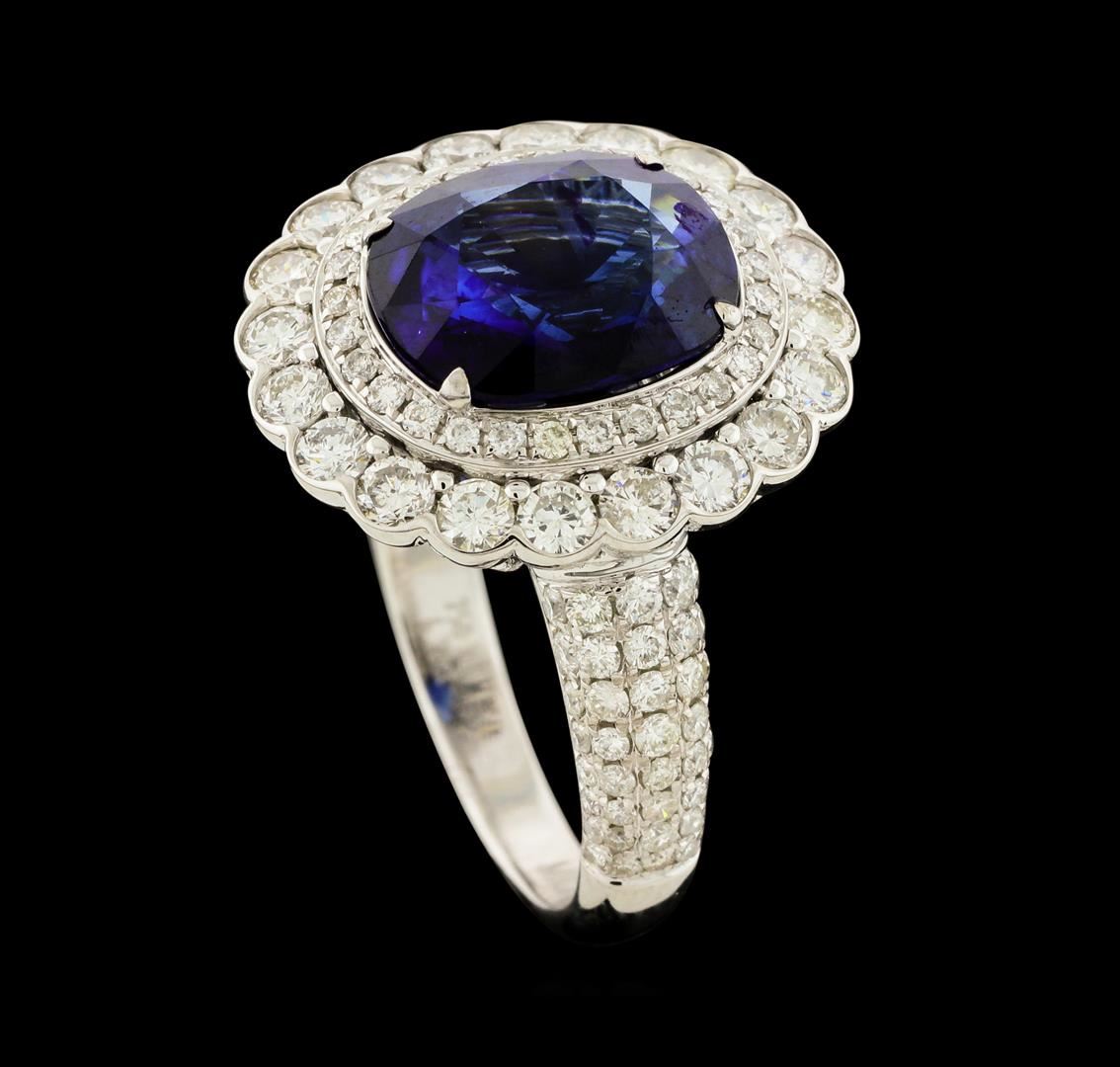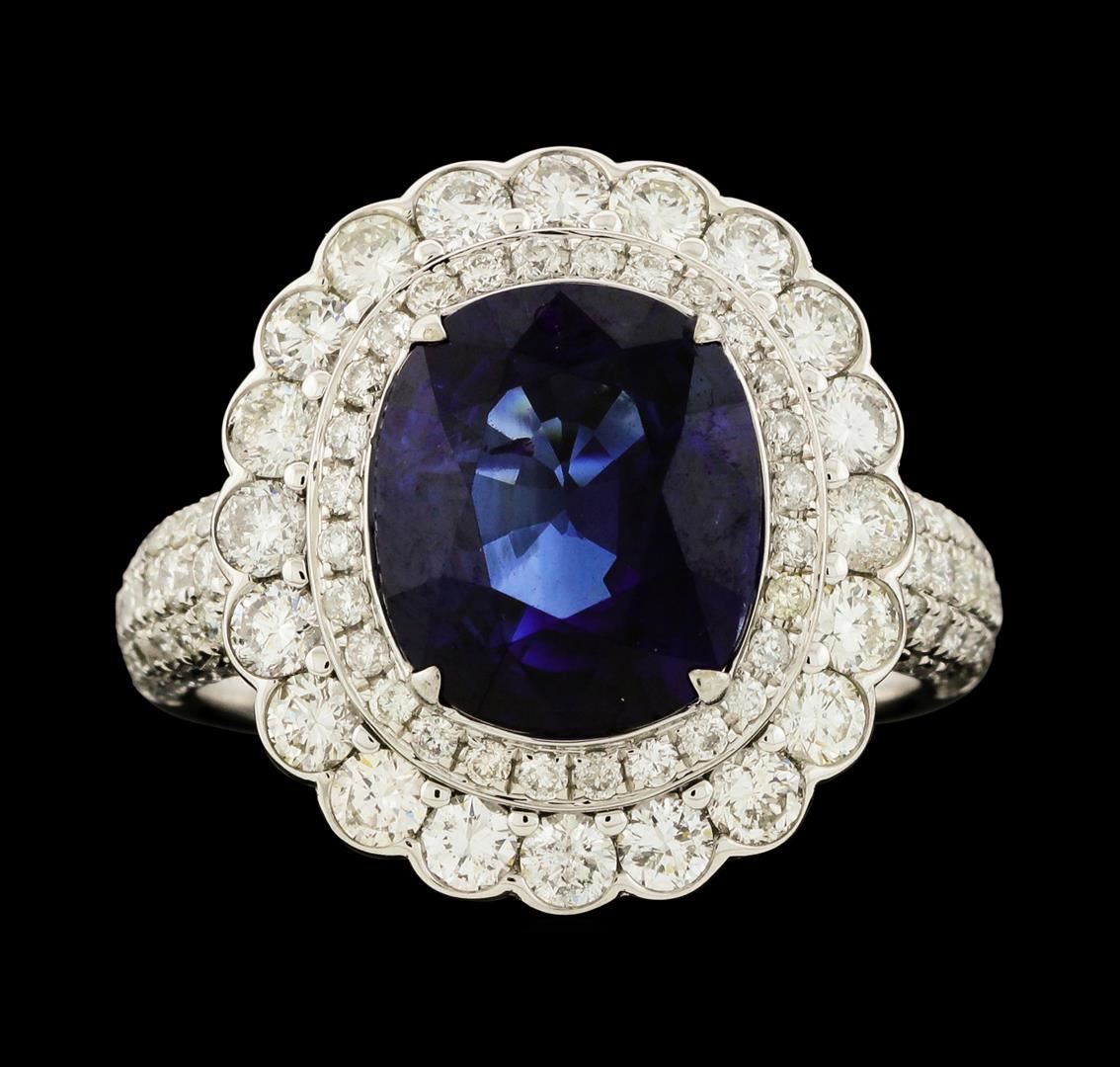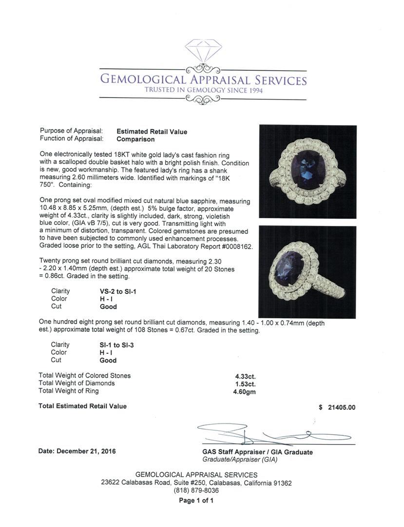 One electronically tested 18KT white gold lady's cast fashion ring with a scalloped double basket halo with a bright polish finish. The featured lady's ring has a shank measuring 2.60 millimeters wide. Identified with markings of '18K 750'. Condition is new, good workmanship. Containing: One prong set oval modified mixed cut natural blue sapphire, measuring 10.48 x 8.85 x 5.25mm, (depth est.) 5%. bulge factor, approximate weight of 4.33ct., clarity is slightly included, dark, strong, violetish blue color, (GIA vB 7/5), cut is very good. Transmitting light with a minimum of distortion, transparent. Colored gemstones are presumed to have been subjected to commonly used enhancement processes. Graded loose prior to the setting, AGL Thai Laboratory Report #0008162. Twenty prong set round brilliant cut diamonds, measuring 2.30 - 2.20 x 1.40mm (depth est.) approximate total weight of 20 Stones = 0.86ct. Graded in the setting. Clarity VS-2 to SI-1. Color: H - I Cut Good One Hundred Eight prong set round brilliant cut diamonds, measuring 1.40 - 1.00 x 0.74mm (depth est.) approximate total weight of 108 Stones = 0.67ct. Graded in the setting. Clarity SI-1 to SI-3. Color: H - I Cut Good. Total Weight of Colored Stones 4.33ct.. Total Weight of Diamonds 1.53ct.. Total Weight of Ring 4.60gm. GAS Appraised at $21,405.00.