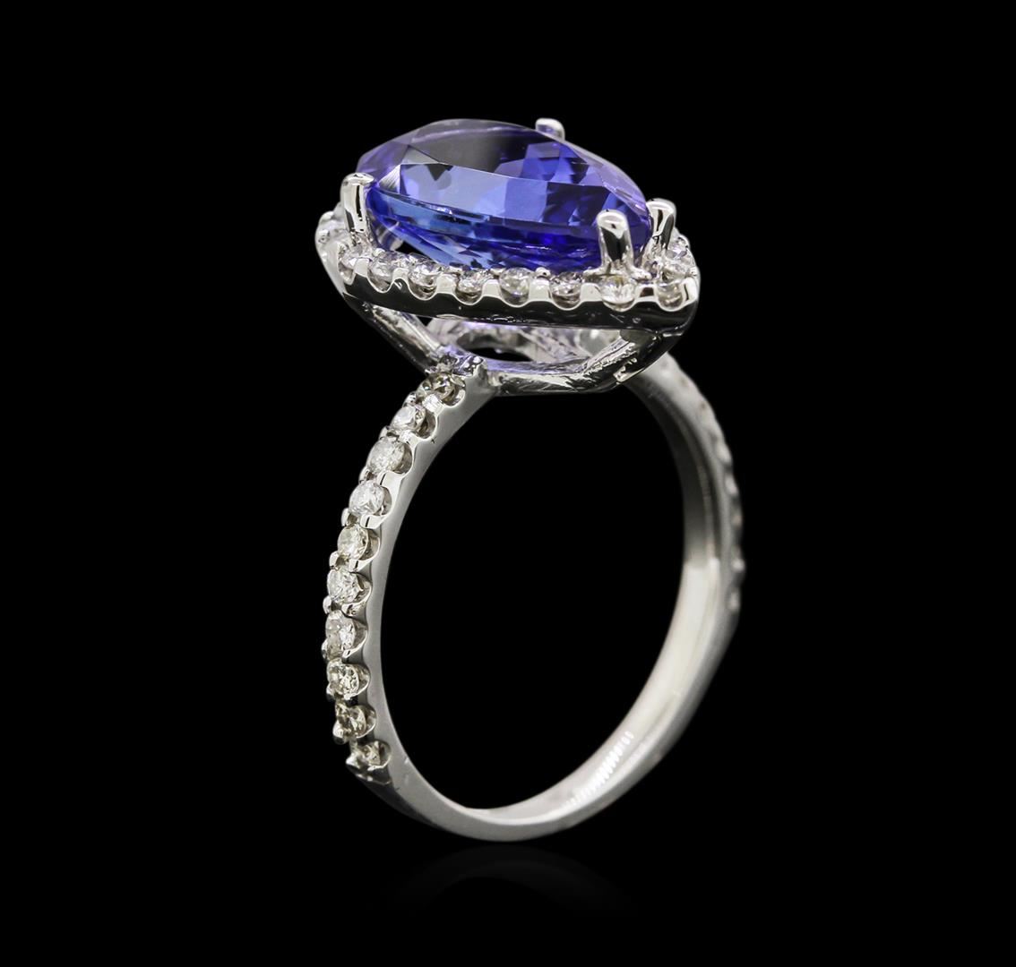 One electronically tested 14KT white gold lady's cast fashion ring with a halo with a bright polish finish. The featured lady's ring has a shank measuring 1.85 millimeters wide. Identified with markings of "K14". Condition is new, good workmanship. Containing: One prong set pear modified brilliant cut natural tanzanite, measuring 13.40 x 8.50 x 5.66mm, approximate weight of 4.33ct., clarity is eye clean, type I, medium, very slightly grayish, bluish violet color, (GIA bV 5/3), cut is good. Transmitting light with no distortion, transparent. Colored gemstones are presumed to have been subjected to commonly used enhancement processes. Graded in the setting. Forty-Three prong set round brilliant cut diamonds, measuring 1.60 - 1.50 x 0.95mm (depth est.) approximate total weight of 43 Stones = 0.60ct. Graded in the setting. Clarity: SI-2 to I-1. Color: H - I. Cut Good. Total Weight of Colored Stones 4.33ct. Total Weight of Diamonds 0.60ct. Total Weight of Ring 4.60gm. GAS Appraised at $6,405.00.