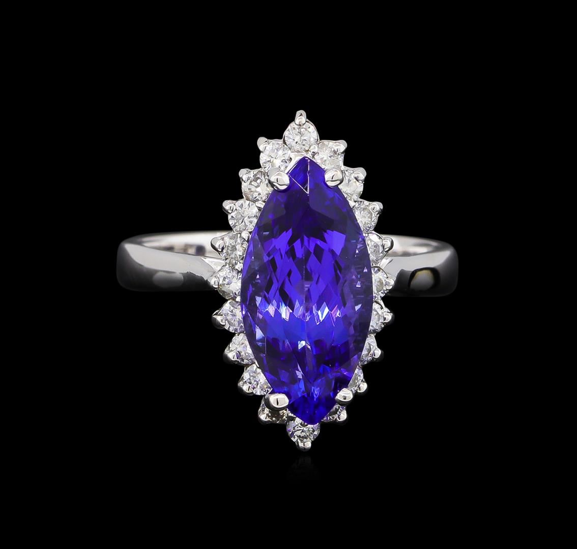 One electronically tested 14KT white gold lady's cast fashion ring with a basket halo with a bright polish finish. The featured lady's ring has a shank measuring 2.91 millimeters wide. Identified with markings of "K14". Condition is new, good workmanship. Containing: One prong set marquise modified brilliant cut natural tanzanite, measuring 15.07 x 7.42 x 6.04mm, approximate weight of 4.33ct., clarity is eye clean, type I, medium dark, moderately strong, violetish blue color, (GIA vB 6/4), cut is very good. Transmitting light with no distortion, transparent. Colored gemstones are presumed to have been subjected to commonly used enhancement processes. Graded in the setting. Twenty prong set round brilliant cut diamonds, measuring 1.90 - 1.80 x 1.15mm (depth est.) approximate total weight of 20 Stones = 0.48ct. Graded in the setting. Clarity: SI-1 to SI-2. Color: H - I. Cut Good. Total Weight of Colored Stones 4.33ct. Total Weight of Diamonds 0.48ct. Total Weight of Ring 5.40gm. GAS Appraised at $9,340.00.
