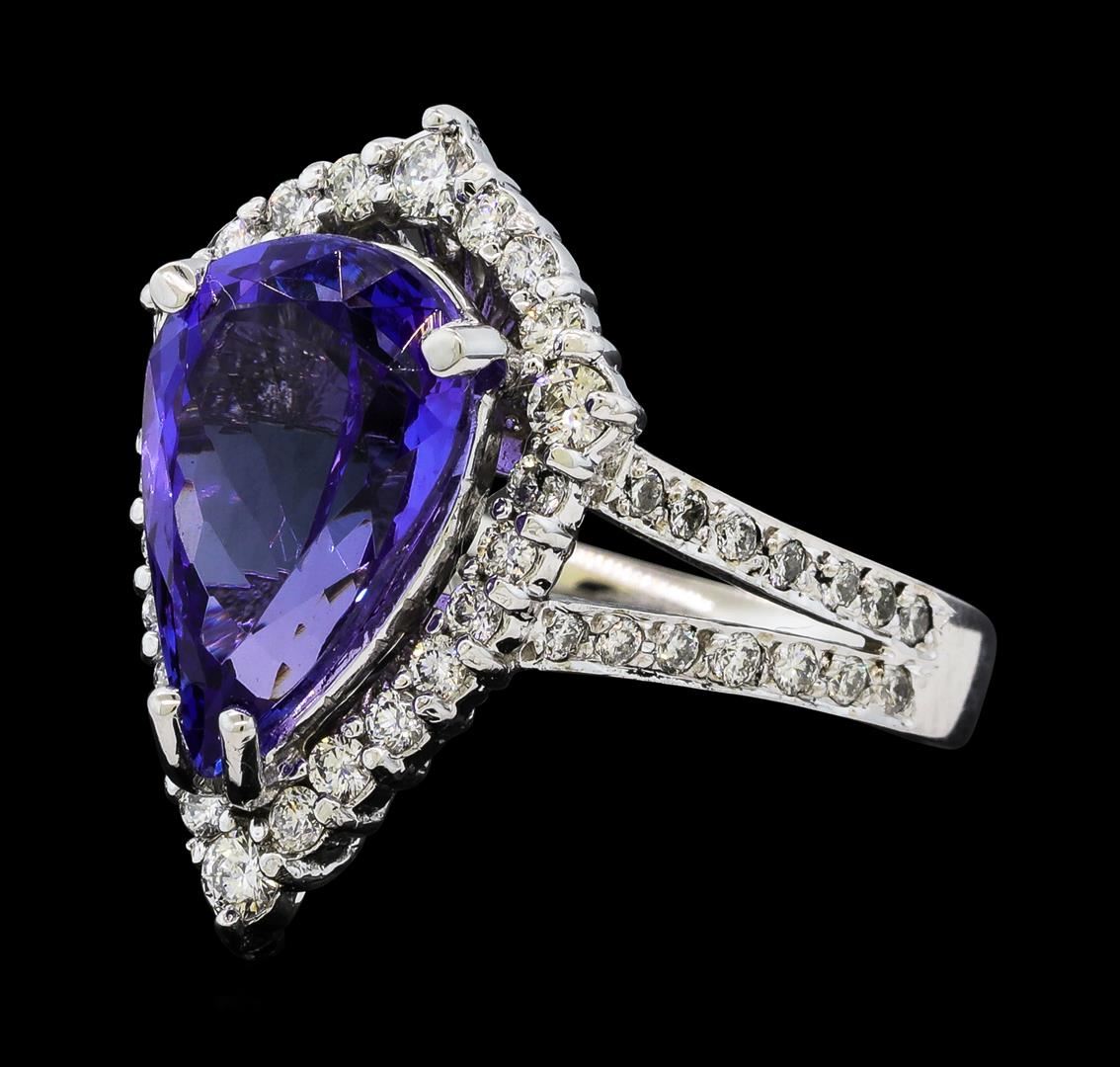 One electronically tested 14KT white gold lady's cast fashion ring with a split shank basket halo with a bright polish finish. The featured lady's ring has a shank measuring 2.70 millimeters wide. Identified with markings of 'K14'. Condition is new, good workmanship. Containing: One prong set pear modified brilliant cut natural tanzanite, measuring 13.05 x 8.55 x 5.60mm, (depth est.) approximate weight of 4.33ct., clarity is eye clean, medium dark, moderately strong, violetish blue color, (GIA vB 6/4), cut is very good. Transmitting light with no distortion, transparent. Colored gemstones are presumed to have been subjected to commonly used enhancement processes. Graded in the setting. Four prong set round brilliant cut diamonds, measuring 2.05 - 1.95 x 1.20mm (depth est.) approximate total weight of 4 Stones = 0.12ct. Graded in the setting. Clarity SI-1. Color: H Cut Good Forty-Eight prong set round brilliant cut diamonds, measuring 1.50 - 1.35 x 0.89mm (depth est.) approximate total weight of 48 Stones = 0.55ct. Graded in the setting. Clarity SI-1 to SI-2. Color: H - I Cut Good. Total Weight of Colored Stones 4.33ct.. Total Weight of Diamonds 0.67ct.. Total Weight of Ring 6.30gm. GAS Appraised at $10,255.00.