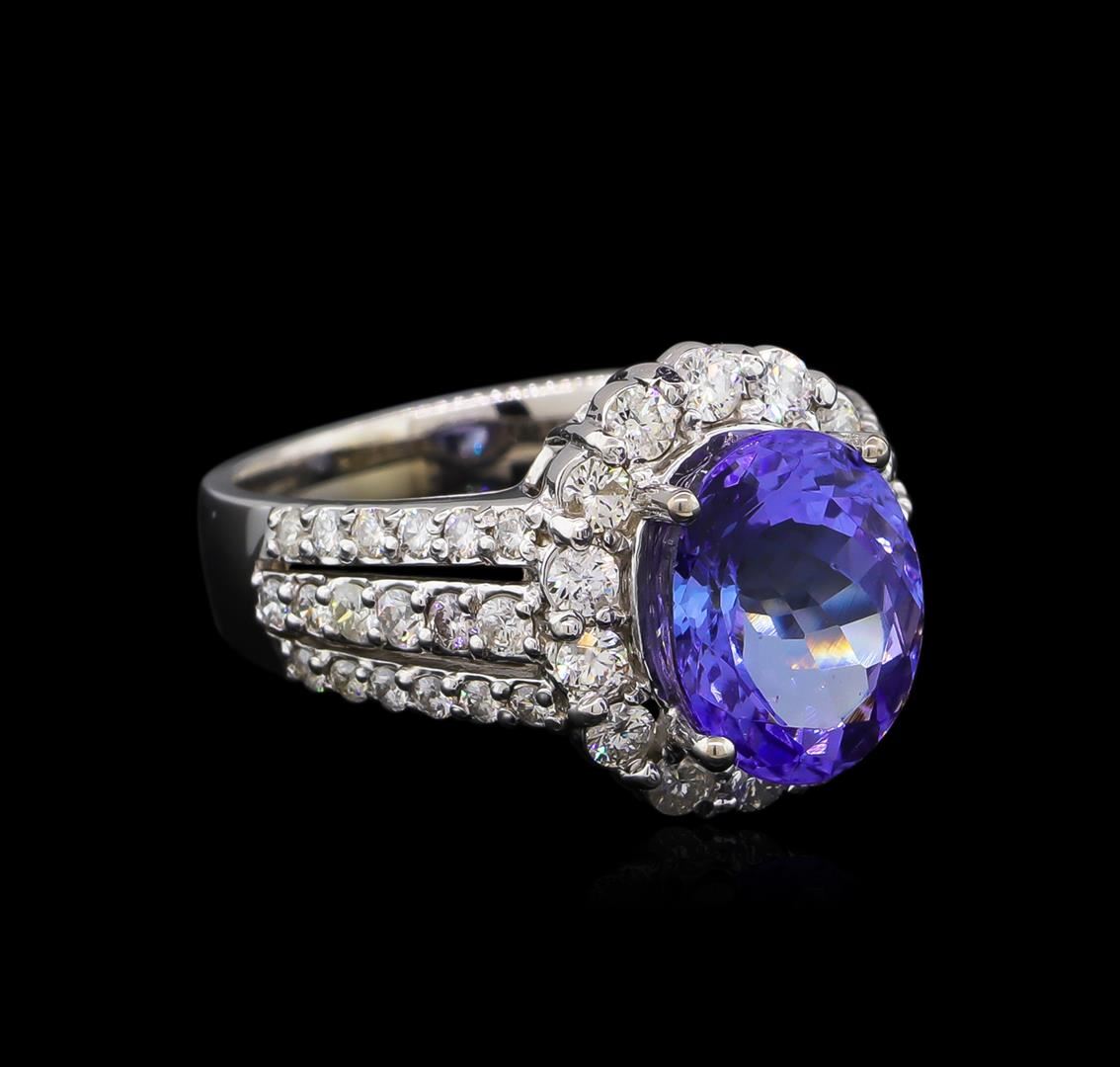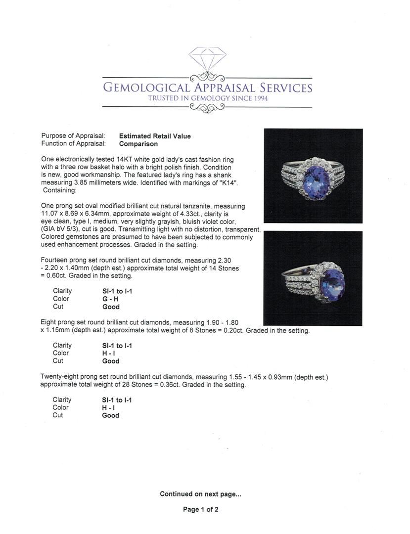 One electronically tested 14KT white gold lady's cast fashion ring with a three row basket halo with a bright polish finish. The featured lady's ring has a shank measuring 3.85 millimeters wide. Identified with markings of "K14". Condition is new, good workmanship. Containing: One prong set oval modified brilliant cut natural tanzanite, measuring 11.07 x 8.69 x 6.34mm, approximate weight of 4.33ct., clarity is eye clean, type I, medium, very slightly grayish, bluish violet color, (GIA bV 5/3), cut is good. Transmitting light with no distortion, transparent. Colored gemstones are presumed to have been subjected to commonly used enhancement processes. Graded in the setting. Fourteen prong set round brilliant cut diamonds, measuring 2.30 - 2.20 x 1.40mm (depth est.) approximate total weight of 14 Stones = 0.60ct. Graded in the setting. Clarity: SI-1 to I-1. Color: G - Good Eight prong set round brilliant cut diamonds, measuring 1.90 - 1.80 x 1.15mm (depth est.) approximate total weight of 8 Stones = 0.20ct. Graded in the setting. Clarity: SI-1 to I-1. Color: H - I. Cut Good Twenty-Eight prong set round brilliant cut diamonds, measuring 1.55 - 1.45 x 0.93mm (depth est.) approximate total weight of 28 Stones = 0.36ct. Graded in the setting. Clarity: SI-1 to I-1. Color: H - I. Cut Good. Total Weight of Colored Stones 4.33ct. Total Weight of Diamonds 1.16ct. Total Weight of Ring 8.20gm. GAS Appraised at $9,740.00.