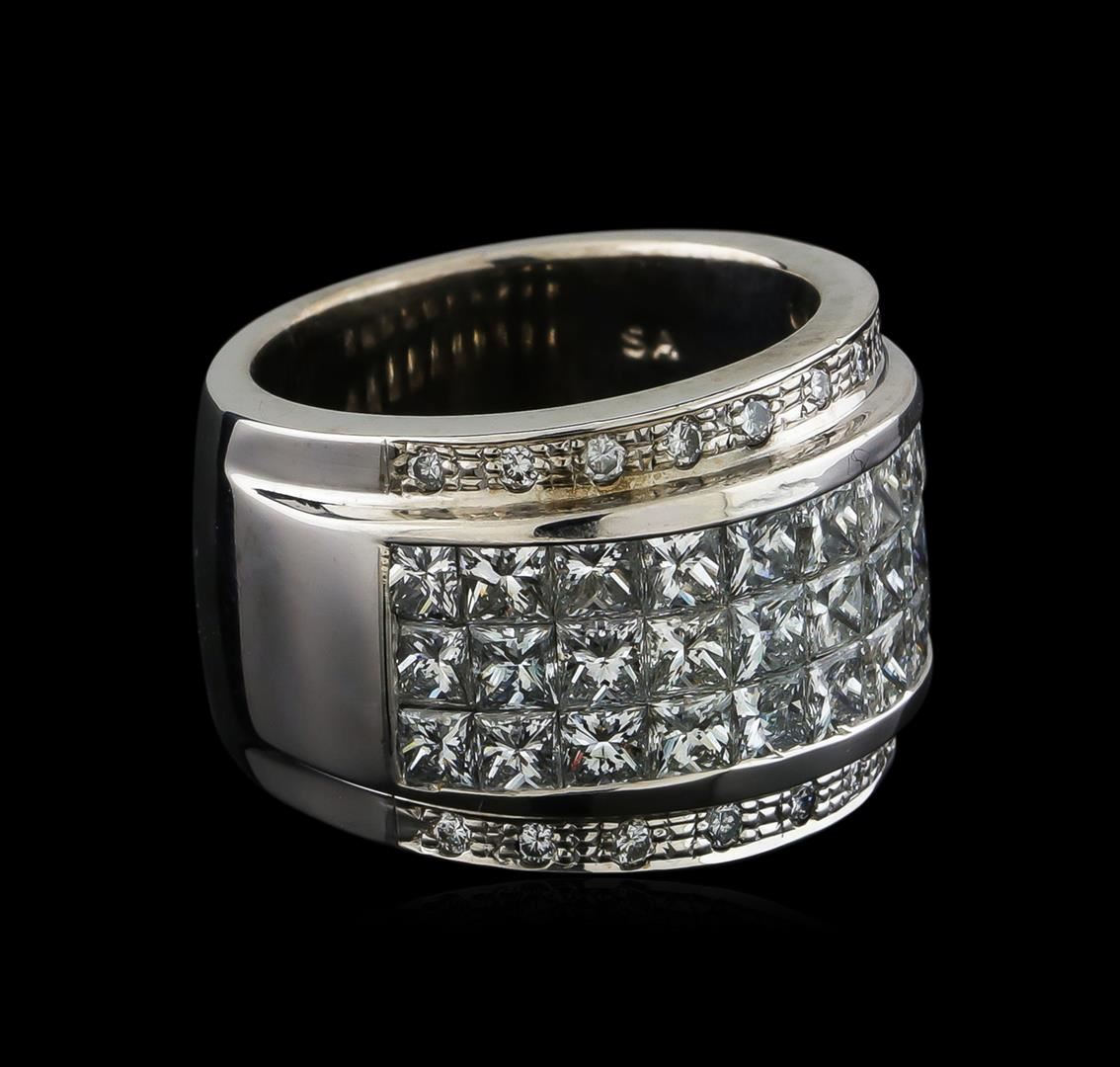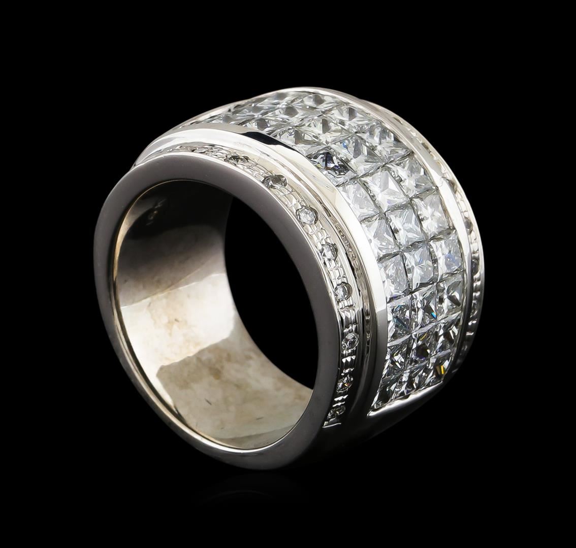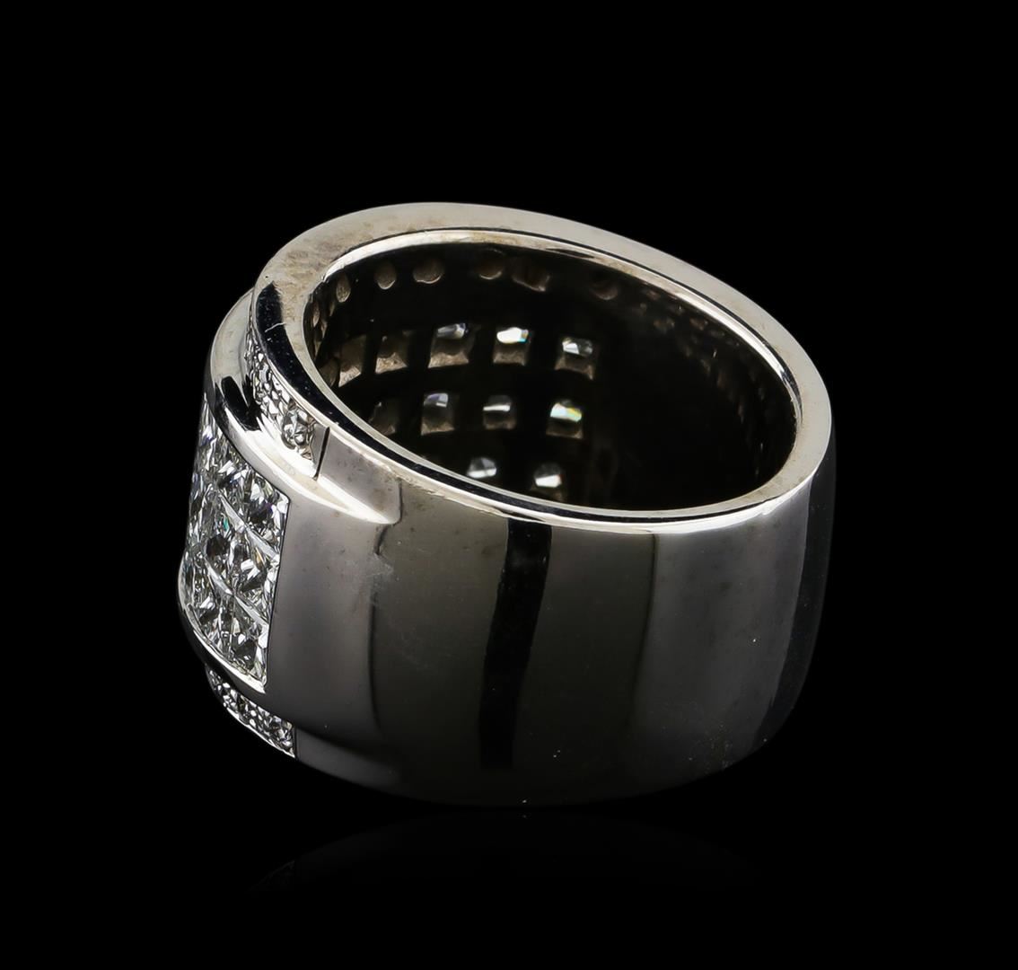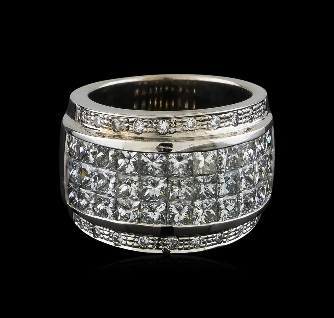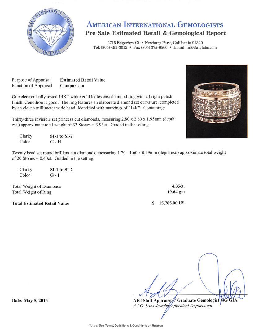 One electronically tested 14KT white gold ladies cast diamond ring with a bright polish finish. The ring features an elaborate diamond set curvature, completed by an eleven millimeter wide band. Identified with markings of "14K". Condition is good. Containing: Thirty-Three invisible set princess cut diamonds, measuring 2.80 x 2.60 x 1.95mm (depth est.) approximate total weight of 33 Stones = 3.95ct. Graded in the setting. Clarity: SI-1 to SI-2. Color: G - H Twenty bead set round brilliant cut diamonds, measuring 1.70 - 1.60 x 0.99mm (depth est.) approximate total weight of 20 Stones = 0.40ct. Graded in the setting. Clarity: SI-1 to SI-2. Color: G - I. Total Weight of Diamonds 4.35ct. Total Weight of Ring 19.64gm. AIG Appraised at $15,785.00.