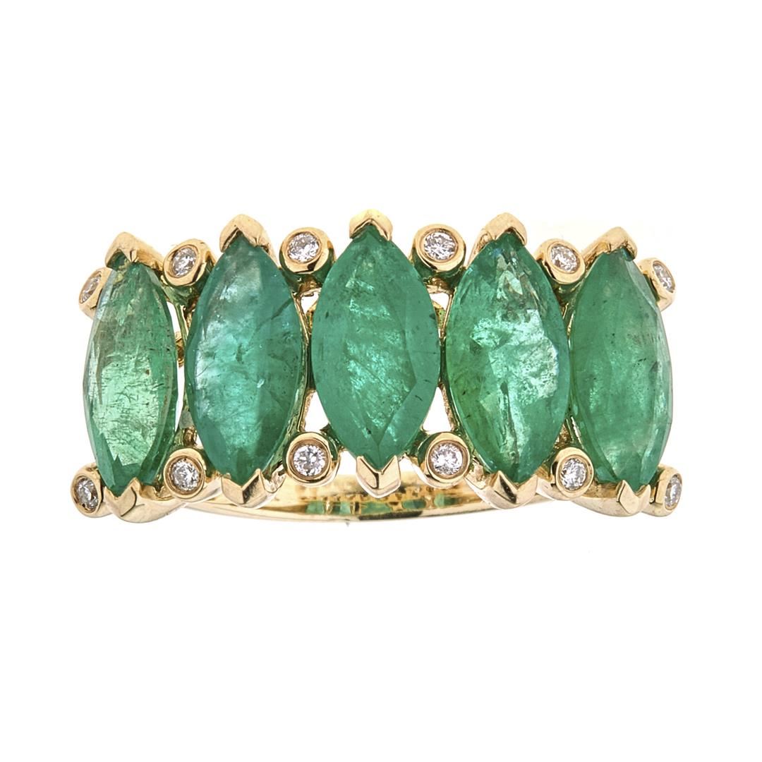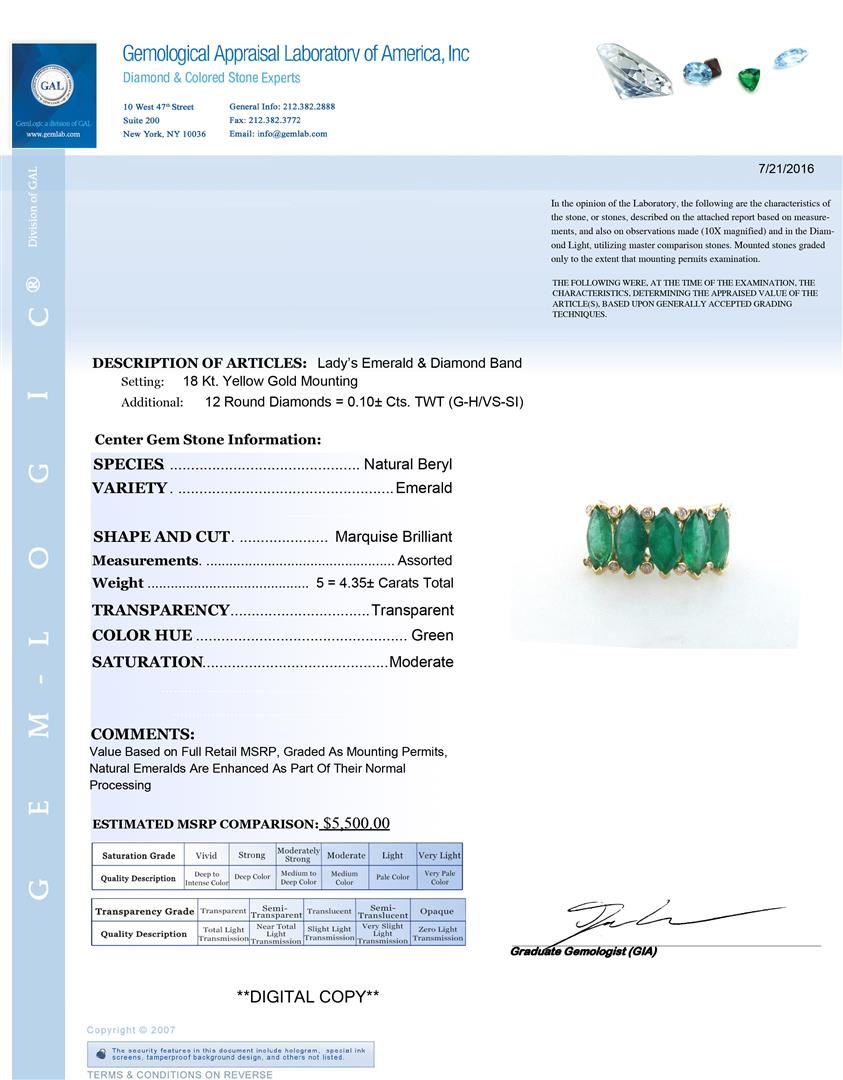 One Lady's Emerald and Diamond Band. Setting: 18 Kt. Yellow Gold Mounting. Additional: 12 Round Diamonds = 0.10 Cts. TWT (G-H/VS-SI). Center Gem Stone Information: Species: Natural Beryl. Variety: Emerald. Shape and Cut: Marquise Brilliant. Measurements: Assorted. Weight: 5 = 4.35 Carats Total. Transparency: Transparent. Color Hue: Green. Saturation: Moderate. Total Weight: 3.94 grams.
