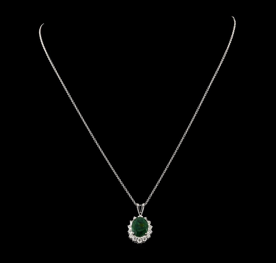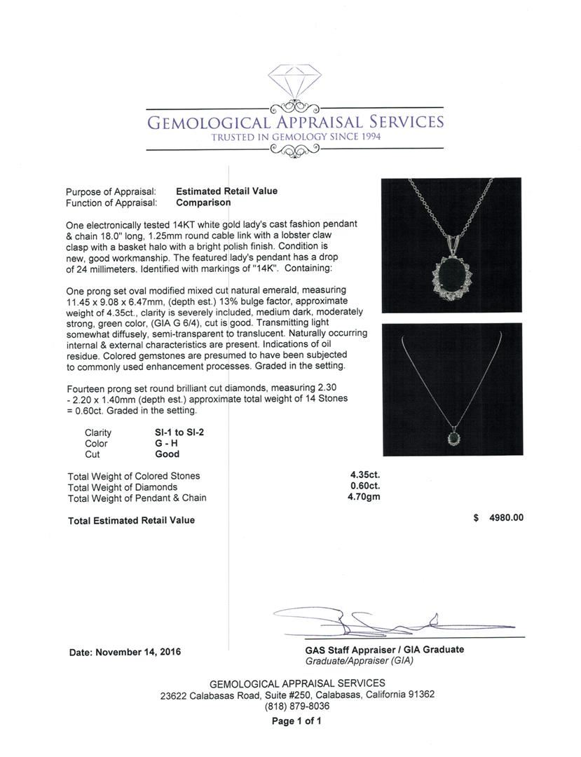 One electronically tested 14KT white gold lady's cast fashion pendant & chain 18.0' long, 1.25mm round cable link with a lobster claw clasp with a basket halo with a bright polish finish. The featured lady's pendant has a drop of 24 millimeters. Identified with markings of '14K'. Condition is new, good workmanship. Containing: One prong set oval modified mixed cut natural emerald, measuring 11.45 x 9.08 x 6.47mm, (depth est.) 13%. bulge factor, approximate weight of 4.35ct., clarity is severely included, medium dark, moderately strong, green color, (GIA G 6/4), cut is good. Transmitting light somewhat diffusely, semi-transparent to translucent. Naturally occurring internal & external characteristics are present. Indications of oil residue. Colored gemstones are presumed to have been subjected to commonly used enhancement processes. Graded in the setting. Fourteen prong set round brilliant cut diamonds, measuring 2.30 - 2.20 x 1.40mm (depth est.) approximate total weight of 14 Stones = 0.60ct. Graded in the setting. Clarity SI-1 to SI-2. Color: G - H Cut Good. Total Weight of Colored Stones 4.35ct.. Total Weight of Diamonds 0.60ct.. Total Weight of Pendant & Chain 4.70gm GAS Appraised at $4,980.00.
