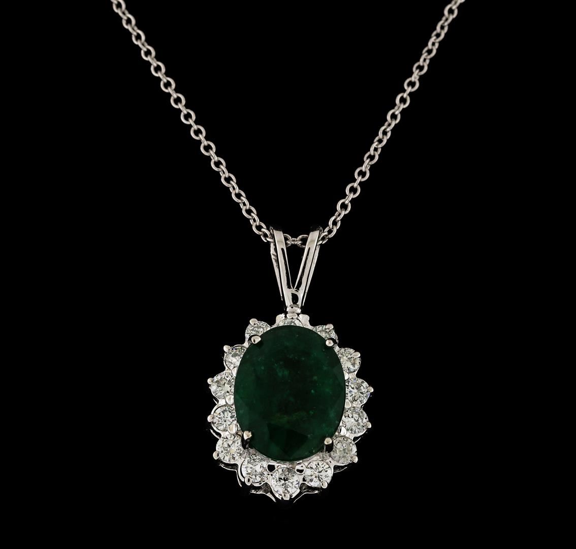 One electronically tested 14KT white gold lady's cast fashion pendant & chain 18.0' long, 1.25mm round cable link with a lobster claw clasp with a basket halo with a bright polish finish. The featured lady's pendant has a drop of 24 millimeters. Identified with markings of '14K'. Condition is new, good workmanship. Containing: One prong set oval modified mixed cut natural emerald, measuring 11.45 x 9.08 x 6.47mm, (depth est.) 13%. bulge factor, approximate weight of 4.35ct., clarity is severely included, medium dark, moderately strong, green color, (GIA G 6/4), cut is good. Transmitting light somewhat diffusely, semi-transparent to translucent. Naturally occurring internal & external characteristics are present. Indications of oil residue. Colored gemstones are presumed to have been subjected to commonly used enhancement processes. Graded in the setting. Fourteen prong set round brilliant cut diamonds, measuring 2.30 - 2.20 x 1.40mm (depth est.) approximate total weight of 14 Stones = 0.60ct. Graded in the setting. Clarity SI-1 to SI-2. Color: G - H Cut Good. Total Weight of Colored Stones 4.35ct.. Total Weight of Diamonds 0.60ct.. Total Weight of Pendant & Chain 4.70gm GAS Appraised at $4,980.00.