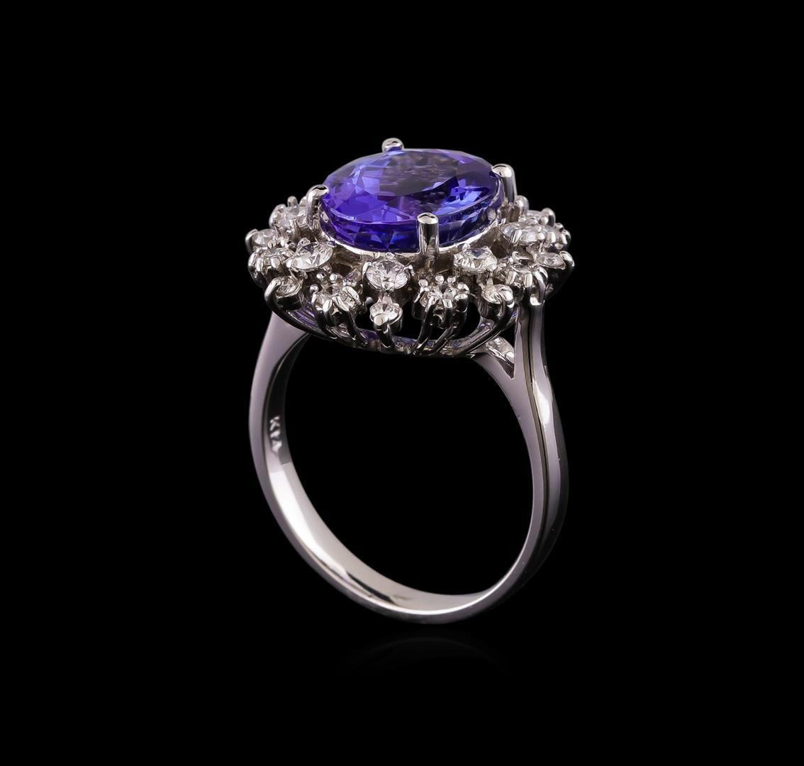 One electronically tested 14KT white gold lady's cast fashion ring with a basket double halo with a bright polish finish. The featured lady's ring has a shank measuring 2.69 millimeters wide. Identified with markings of "K14". Condition is new, good workmanship. Containing: One prong set oval modified brilliant cut natural tanzanite, measuring 11.10 x 9.00 x 6.15mm, (depth est.) approximate weight of 4.35ct., clarity is eye clean, medium light, moderately strong, violetish blue color, (GIA vB 4/4), cut is very good. Transmitting light with no distortion, transparent. Colored gemstones are presumed to have been subjected to commonly used enhancement processes. Graded in the setting. Eight prong set round brilliant cut diamonds, measuring 2.30 - 2.20 x 1.40mm (depth est.) approximate total weight of 8 Stones = 0.36ct. Graded in the setting. Clarity: SI-1 to SI-2. Color: H - I. Cut Good Eight prong set round brilliant cut diamonds, measuring 1.90 - 1.80 x 1.11mm (depth est.) approximate total weight of 8 Stones = 0.18ct. Graded in the setting. Clarity: SI-1 to SI-2. Color: H - I. Cut Good Eight round brilliant cut diamonds, measuring 1.60 - 1.50 x 0.93mm (depth est.) approximate total weight of 8 Stones = 0.11ct. Graded in the setting. Clarity: SI-1 to SI-2. Color: H - I. Cut Good. Total Weight of Colored Stones 4.35ct. Total Weight of Diamonds 0.65ct. Total Weight of Ring 5.70gm.