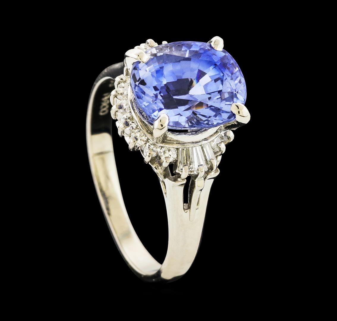 One ring featuring: Platinum containing Tanzanite with a total weight of 4.35ct and Diamonds with a total weight of 0.29ct. Total Weight of Ring: 5.8 grams.