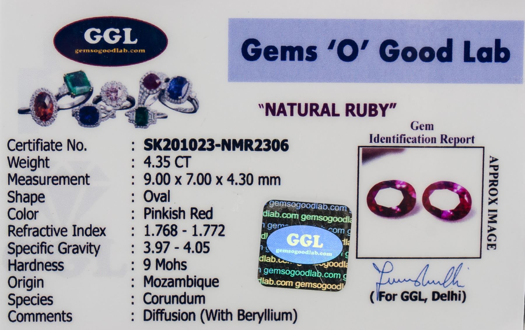 Two (2) 4.35 ct (total) oval cut pinkish red natural rubies. Origin: Mozambique. Accompanied with GGL certificate. 9.00 x 7.00 x 4.30 mm.