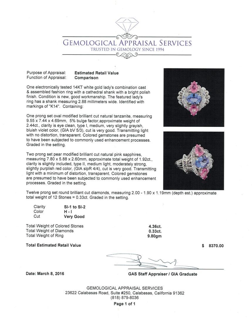 One electronically tested 14KT white gold lady's combination cast & assembled fashion ring with a cathedral shank with a bright polish finish. The featured lady's ring has a shank measuring 2.88 millimeters wide. Identified with markings of "K14". Condition is new, good workmanship. Containing: One prong set oval modified brilliant cut natural tanzanite, measuring 9.55 x 7.44 x 4.69mm, 5%. bulge factor, approximate weight of 2.44ct., clarity is eye clean, type I, medium, very slightly grayish, bluish violet color, (GIA bV 5/3), cut is very good. Transmitting light with no distortion, transparent. Colored gemstones are presumed to have been subjected to commonly used enhancement processes. Graded in the setting. Two prong set pear modified brilliant cut natural pink sapphires, measuring 7.80 x 5.88 x 2.60mm, approximate total weight of 1.92ct., clarity is slightly included, type II, medium light, moderately strong, slightly purplish red color, (GIA slpR 4/4), cut is very good. Transmitting light with a minimum of distortion, transparent. Colored gemstones are presumed to have been subjected to commonly used enhancement processes. Graded in the setting. Twelve prong set round brilliant cut diamonds, measuring 2.00 - 1.90 x 1.19mm (depth est.) approximate total weight of 12 Stones = 0.33ct. Graded in the setting. Clarity: SI-1 to SI-2. Color: H - I. Cut Very Good. Total Weight of Colored Stones 4.36ct. Total Weight of Diamonds 0.33ct. Total Weight of Ring 9.80gm. GAS Appraised at $8,370.00.