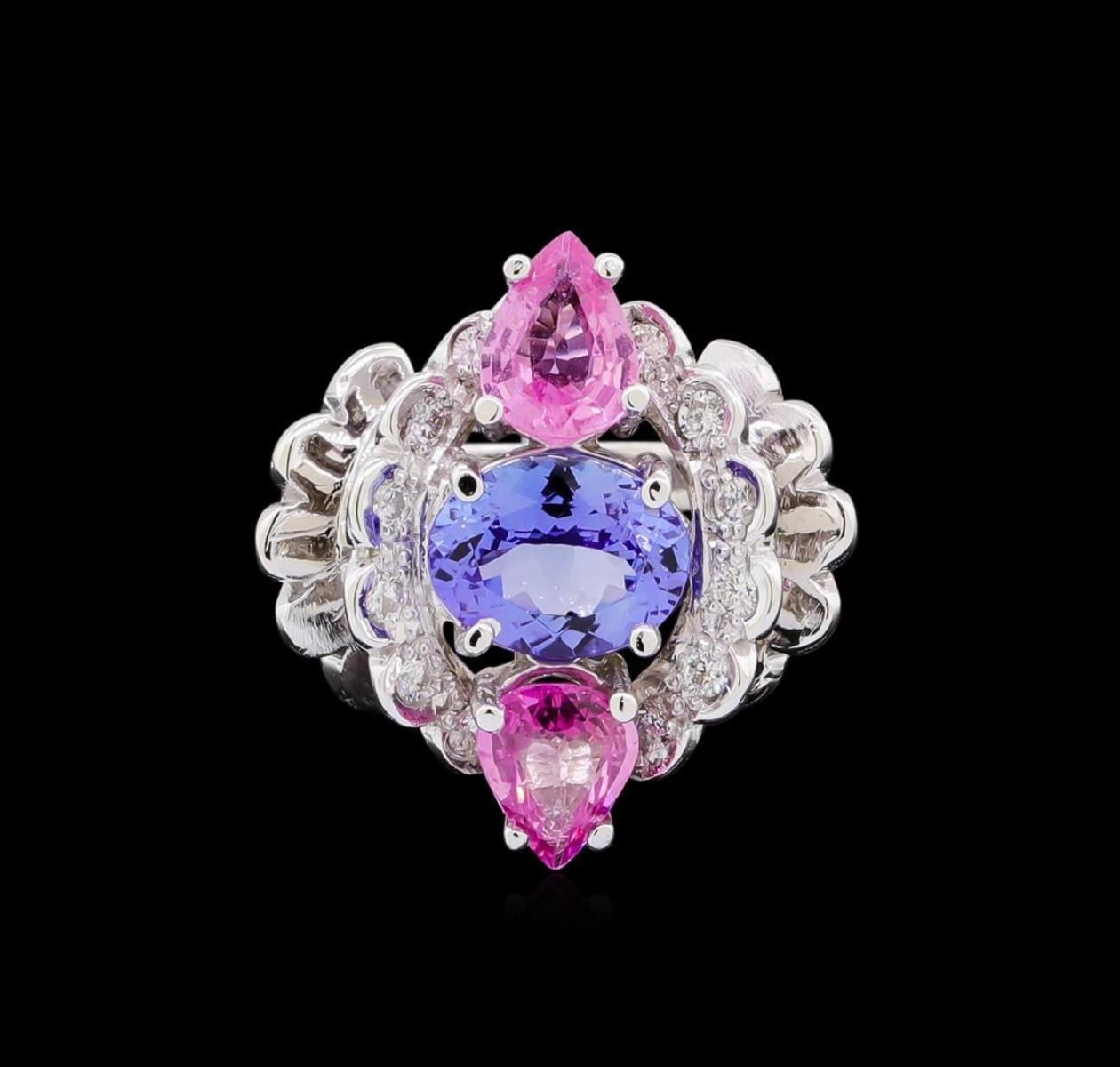 One electronically tested 14KT white gold lady's combination cast & assembled fashion ring with a cathedral shank with a bright polish finish. The featured lady's ring has a shank measuring 2.88 millimeters wide. Identified with markings of "K14". Condition is new, good workmanship. Containing: One prong set oval modified brilliant cut natural tanzanite, measuring 9.55 x 7.44 x 4.69mm, 5%. bulge factor, approximate weight of 2.44ct., clarity is eye clean, type I, medium, very slightly grayish, bluish violet color, (GIA bV 5/3), cut is very good. Transmitting light with no distortion, transparent. Colored gemstones are presumed to have been subjected to commonly used enhancement processes. Graded in the setting. Two prong set pear modified brilliant cut natural pink sapphires, measuring 7.80 x 5.88 x 2.60mm, approximate total weight of 1.92ct., clarity is slightly included, type II, medium light, moderately strong, slightly purplish red color, (GIA slpR 4/4), cut is very good. Transmitting light with a minimum of distortion, transparent. Colored gemstones are presumed to have been subjected to commonly used enhancement processes. Graded in the setting. Twelve prong set round brilliant cut diamonds, measuring 2.00 - 1.90 x 1.19mm (depth est.) approximate total weight of 12 Stones = 0.33ct. Graded in the setting. Clarity: SI-1 to SI-2. Color: H - I. Cut Very Good. Total Weight of Colored Stones 4.36ct. Total Weight of Diamonds 0.33ct. Total Weight of Ring 9.80gm. GAS Appraised.