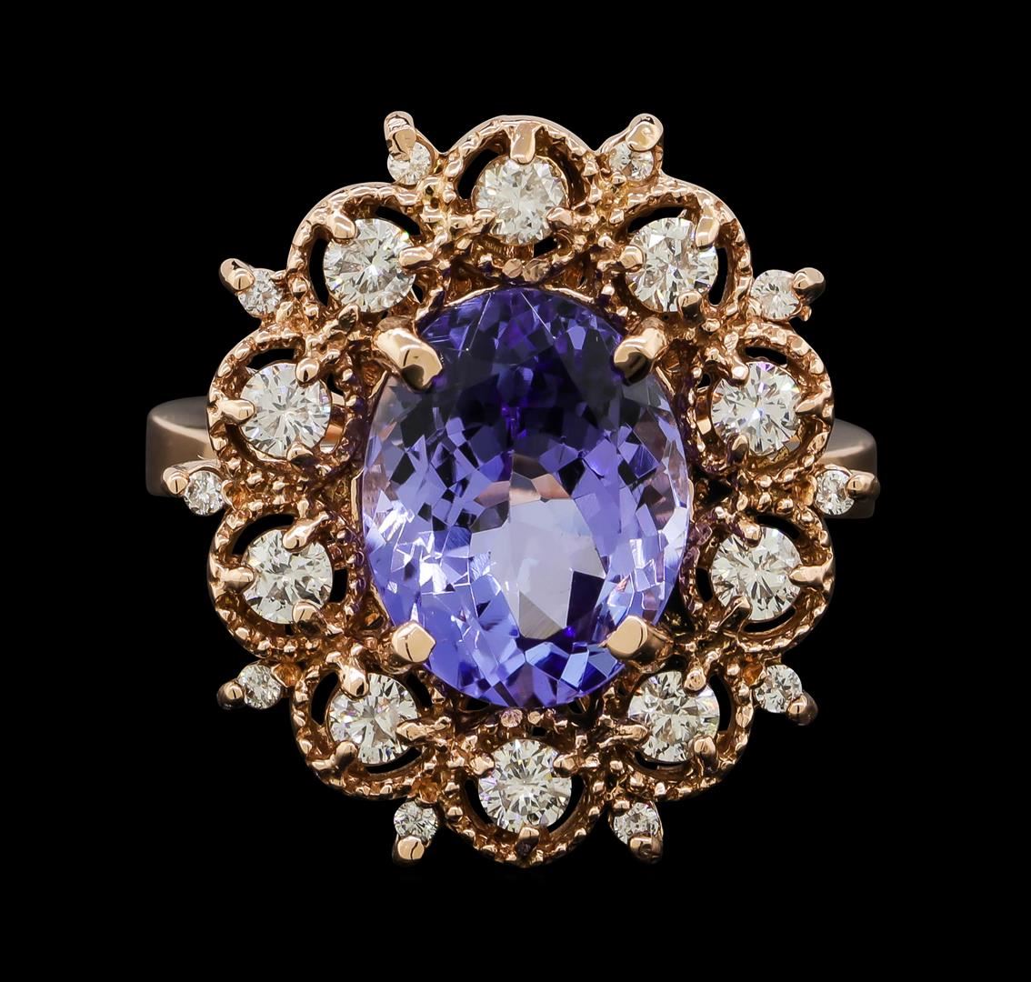 One electronically tested 14KT rose gold lady's cast fashion ring with a double basket halo with a bright polish with milgrain detailing finish. The featured lady's ring has a shank measuring 2.84 millimeters wide. Identified with markings of 'K14'. Condition is new, good workmanship. Containing: One prong set oval modified brilliant cut natural tanzanite, measuring 11.16 x 9.00 x 5.94mm, (depth est.) approximate weight of 4.36ct., clarity is eye clean, medium light, moderately strong, violet color, (GIA V 4/4), cut is good. Transmitting light with no distortion, transparent. Colored gemstones are presumed to have been subjected to commonly used enhancement processes. Graded in the setting. Ten prong set round brilliant cut diamonds, measuring 2.60 - 2.55 x 1.60mm (depth est.) approximate total weight of 10 Stones = 0.65ct. Graded in the setting. Clarity SI-1 to I-1. Color: G - I Cut Good Ten prong set round brilliant cut diamonds, measuring 1.40 - 1.30 x 0.81mm (depth est.) approximate total weight of 10 Stones = 0.09ct. Graded in the setting. Clarity SI-1 to SI-2. Color: H - I Cut Good. Total Weight of Colored Stones 4.36ct.. Total Weight of Diamonds 0.74ct.. Total Weight of Ring 8.10gm. GAS Appraised at $7,920.00.