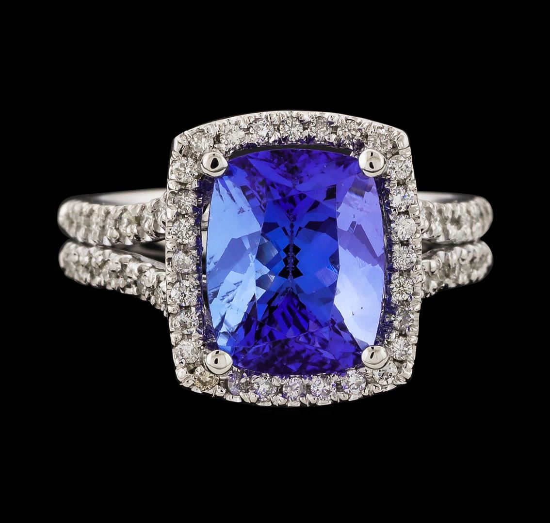 One electronically tested 14KT white gold lady's cast fashion ring with a split cathedral shank with a halo with a bright polish finish. The featured lady's ring has a double shank measuring 3.51 millimeters wide. Identified with markings of '14K'. Condition is new, good workmanship. Containing: One prong set rectangular cushion modified brilliant cut natural tanzanite, measuring 10.15 x 8.01 x 6.80mm, (depth est.) approximate weight of 4.36ct., clarity is eye clean, medium, moderately strong, violetish blue color, (GIA vB 5/4), cut is good. Transmitting light with no distortion, transparent. Colored gemstones are presumed to have been subjected to commonly used enhancement processes. Graded in the setting. Sixty-Eight prong set round brilliant cut diamonds, measuring 1.25 - 1.15 x 0.74mm (depth est.) approximate total weight of 68 Stones = 0.44ct. Graded in the setting. Clarity SI-1 to SI-3. Color: H - I Cut Good. Total Weight of Colored Stones 4.36ct.. Total Weight of Diamonds 0.44ct.. Total Weight of Ring 5.70gm. GAS Appraised at $8,970.00.
