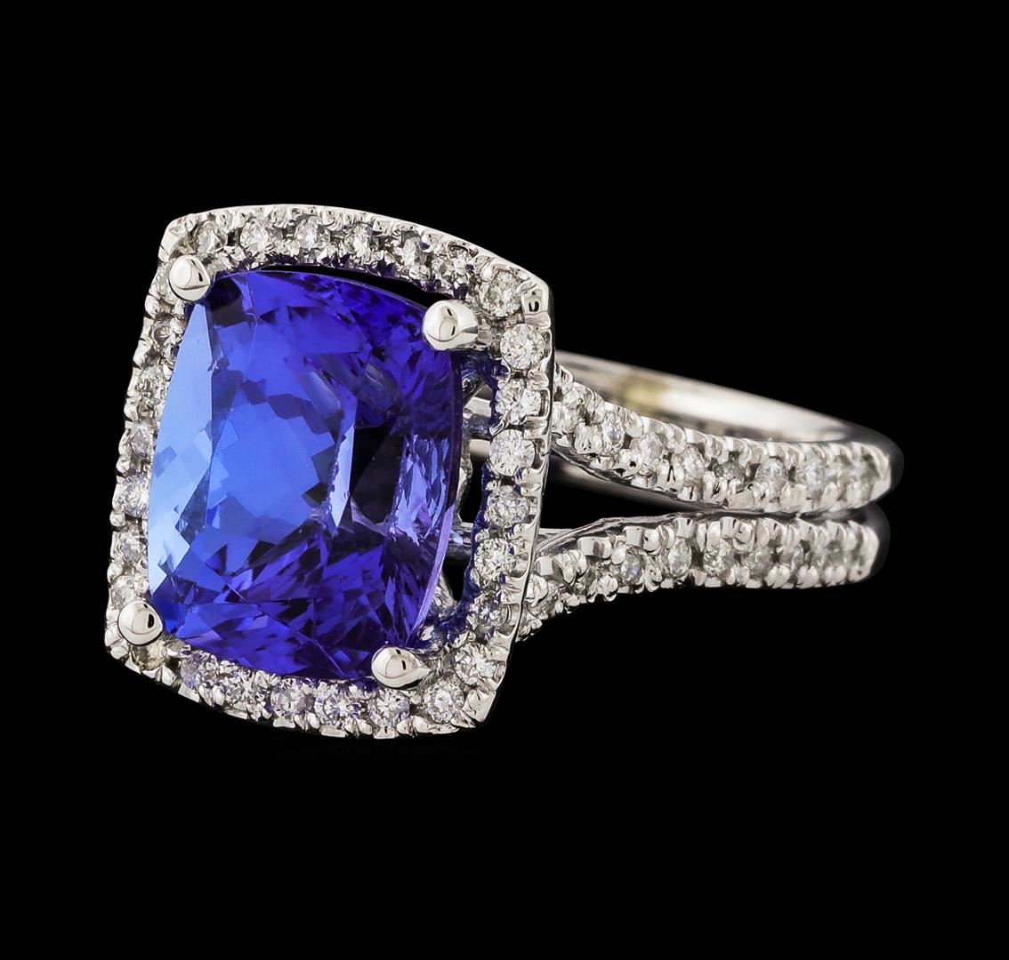 One electronically tested 14KT white gold lady's cast fashion ring with a split cathedral shank with a halo with a bright polish finish. The featured lady's ring has a double shank measuring 3.51 millimeters wide. Identified with markings of '14K'. Condition is new, good workmanship. Containing: One prong set rectangular cushion modified brilliant cut natural tanzanite, measuring 10.15 x 8.01 x 6.80mm, (depth est.) approximate weight of 4.36ct., clarity is eye clean, medium, moderately strong, violetish blue color, (GIA vB 5/4), cut is good. Transmitting light with no distortion, transparent. Colored gemstones are presumed to have been subjected to commonly used enhancement processes. Graded in the setting. Sixty-Eight prong set round brilliant cut diamonds, measuring 1.25 - 1.15 x 0.74mm (depth est.) approximate total weight of 68 Stones = 0.44ct. Graded in the setting. Clarity SI-1 to SI-3. Color: H - I Cut Good. Total Weight of Colored Stones 4.36ct.. Total Weight of Diamonds 0.44ct.. Total Weight of Ring 5.70gm. GAS Appraised at $8,970.00.