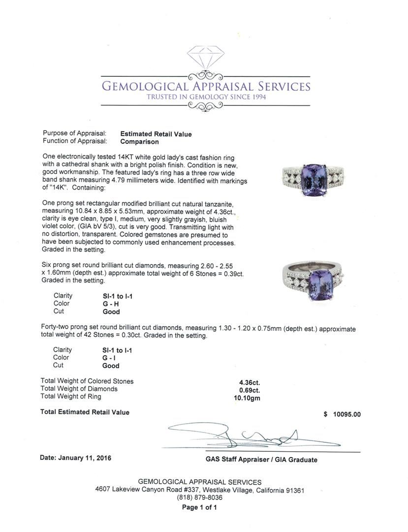 One electronically tested 14KT white gold lady's cast fashion ring with a cathedral shank with a bright polish finish. The featured lady's ring has a three row wide band shank measuring 4.79 millimeters wide. Identified with markings of "14K". Condition is new, good workmanship. Containing: One prong set rectangular modified brilliant cut natural tanzanite, measuring 10.84 x 8.85 x 5.53mm, approximate weight of 4.36ct., clarity is eye clean, type I, medium, very slightly grayish, bluish violet color, (GIA bV 5/3), cut is very good. Transmitting light with no distortion, transparent. Colored gemstones are presumed to have been subjected to commonly used enhancement processes. Graded in the setting. Six prong set round brilliant cut diamonds, measuring 2.60 - 2.55 x 1.60mm (depth est.) approximate total weight of 6 Stones = 0.39ct. Graded in the setting. Clarity: SI-1 to I-1. Color: G - Good Forty-Two prong set round brilliant cut diamonds, measuring 1.30 - 1.20 x 0.75mm (depth est.) approximate total weight of 42 Stones = 0.30ct. Graded in the setting. Clarity: SI-1 to I-1. Color: G - I. Cut Good. Total Weight of Colored Stones 4.36ct. Total Weight of Diamonds 0.69ct. Total Weight of Ring 10.10gm. GAS Appraised at $10,095.00.